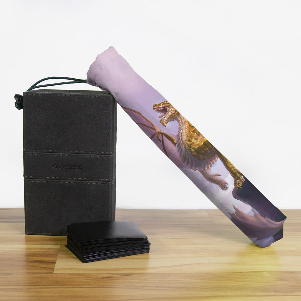 Keep your playmat in pristine condition wherever you go with one of our handcrafted playmat bags. This playmat bag is specifically designed to protect your playmat and can hold two standard sized mats at the same time (in case you need a backup or your friend forgets theirs). Each bag is made in-house and features a water-resistant coating along with a drawstring and carabiner clip for secure carrying. So you can take your game anywhere and in any weather.