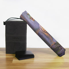 Keep your playmat in pristine condition wherever you go with one of our handcrafted playmat bags. This playmat bag is specifically designed to protect your playmat and can hold two standard sized mats at the same time (in case you need a backup or your friend forgets theirs). Each bag is made in-house and features a water-resistant coating along with a drawstring and carabiner clip for secure carrying. So you can take your game anywhere and in any weather.
