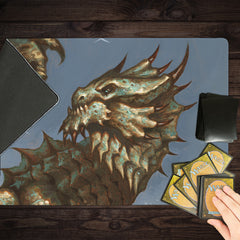 Oversized Playmat measures at 28” x 14” inches and is 1/16 of an inch thick. It’s made with a smooth cloth top and strong rubber backing.