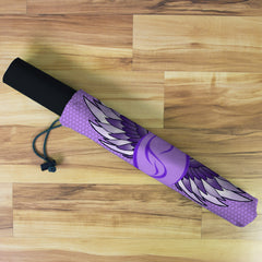 Playmat Bags are specifically designed to hold your mats in style. They are large enough to carry up to two mats. They are coated to be water resistant and include a strap with carabiner for carrying on your backpack. Our bags are hand made in house, and to order. A design that is vertical or patterned would be best for this type of product.
