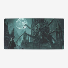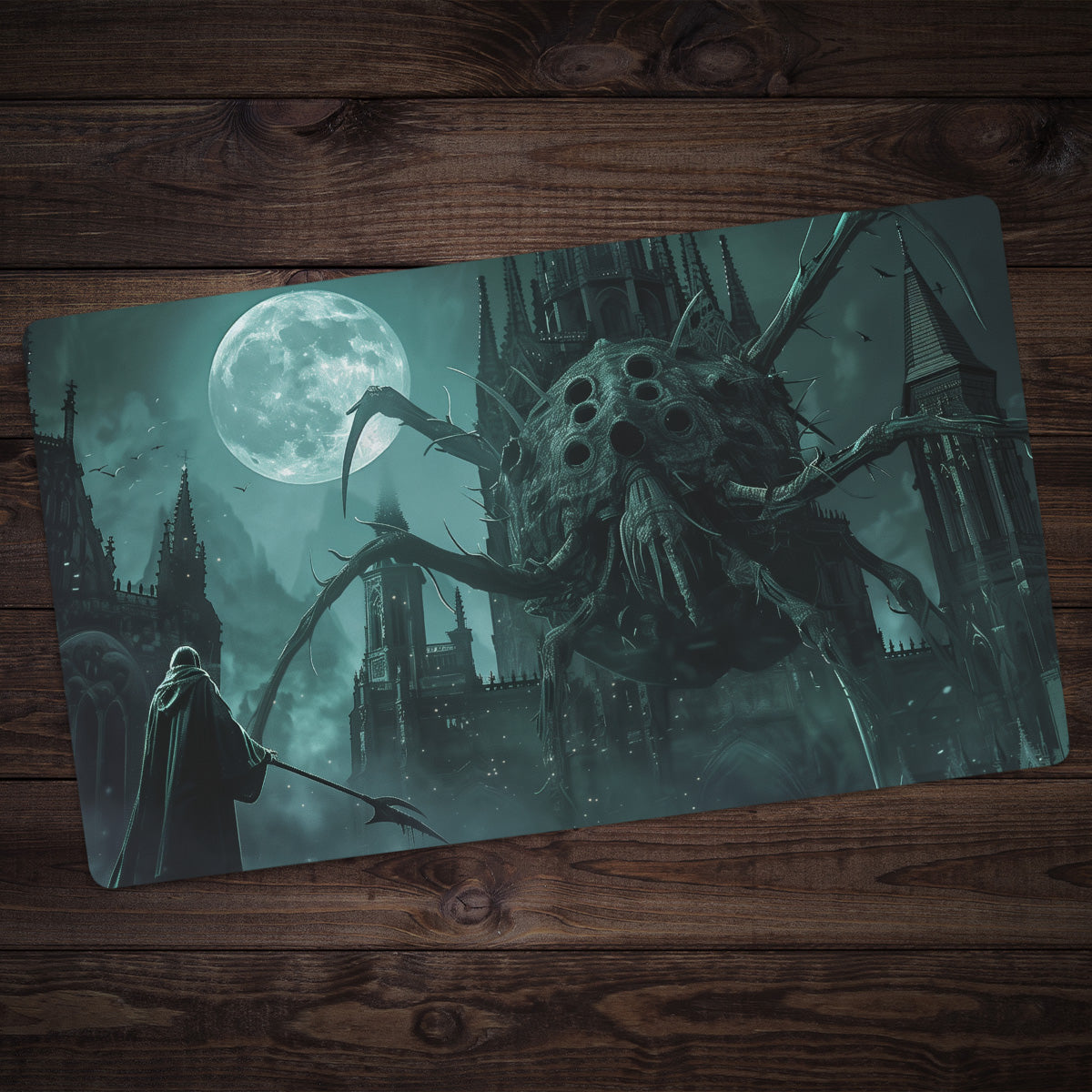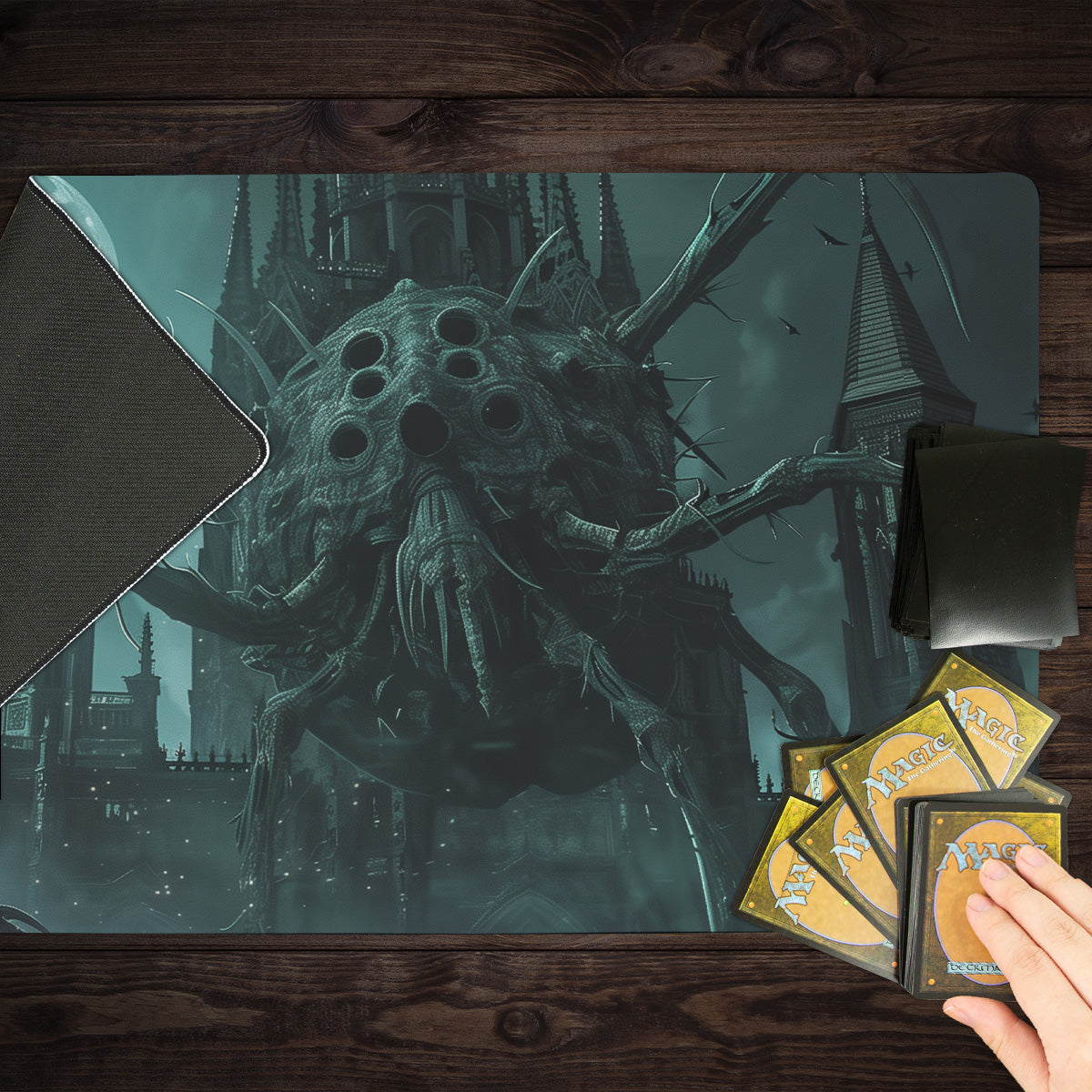 Oversized Playmat measures at 28” x 14” inches and is 1/16 of an inch thick. It’s made with a smooth cloth top and strong rubber backing.