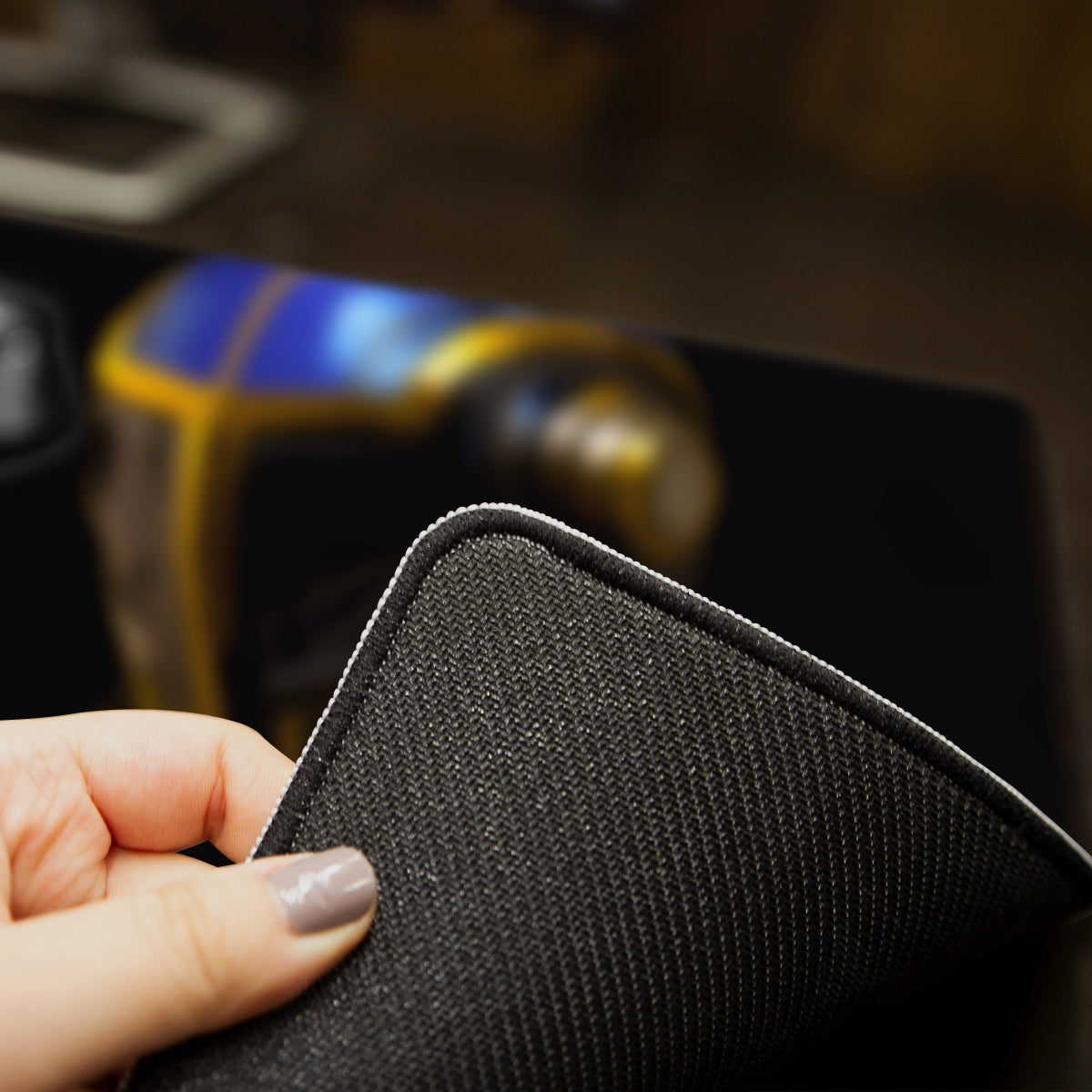 Need a new mousepad that features quality craftsmanship and creativity? Then you’ve definitely come to the right place. Our mousepads are made in-house with premium materials and unique artwork that give your battlestation the supreme look and feel that it deserves. The top is made from sleek polyester, which enables faster, more precise mouse movements. This enhanced speed and precision come in handy whether you’re working or gaming. On the bottom, there’s a strong anti-slip rubber backing that holds a nice, tight grip on your desk while you’re doing your thing. The action and traction this pad provides give you a better overall experience in completing daily tasks, deadlines, and missions of all kinds. And because we’ve added more sizing options to it, you no longer have to worry about running out of room at the worst moments either. The sizes are Classic, Large, and XL. The Classic mousepad has unstitched edges. However, the Large mousepad does include stitched edging, while the XL mousepad has both a stitched or unstitched edging option available. You can see the approximate measurements of all those sizes in the details below. We think you’ll be impressed…if you aren’t already!