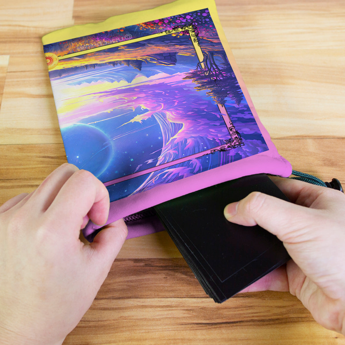 Always gaming on the go? Carry everything you need and more using our specially crafted dice bag. But this bag is designed to hold more than just dice. We make it so you can carry other essential accessories and gear with your dice, including deck boxes, life counters, extra sleeves, and pens. Quality is just as important as quantity, which is why our dice bags are crafted using premium material as well. Featuring a soft inner lining and microfiber on the inside and vibrant pre-designed artwork on the outside, our dice bag has an amazing look and feel to it!