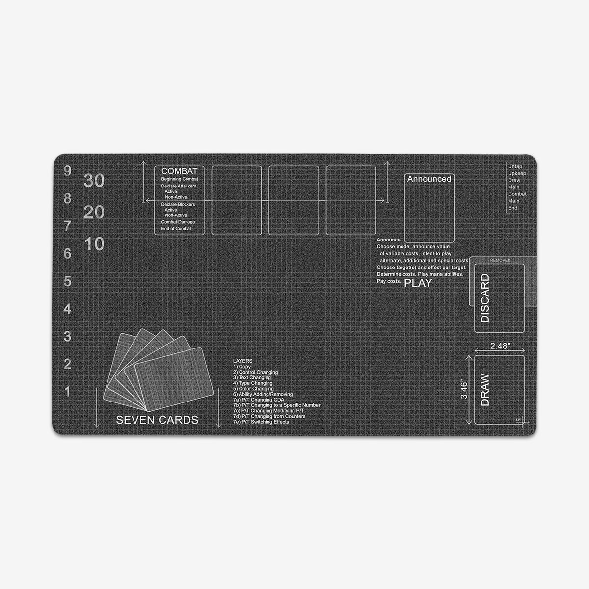Standard Playmat measures at 24” x 14” inches and is 1/16 of an inch thick. It’s made with a smooth cloth top and strong rubber backing.