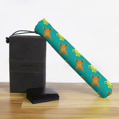 Playmat Bags are specifically designed to hold your mats in style. They are large enough to carry up to two mats. They are coated to be water resistant and include a strap with carabiner for carrying on your backpack. Our bags are hand made in house, and to order. A design that is vertical or patterned would be best for this type of product.