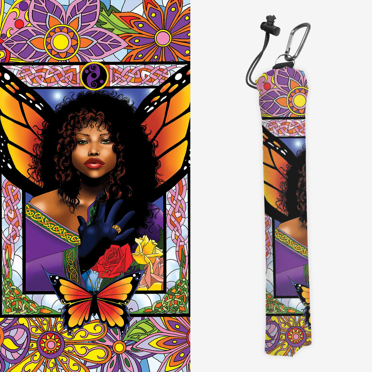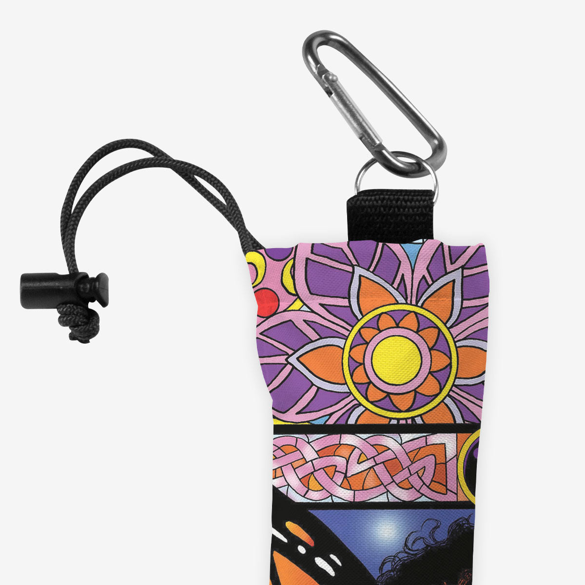 Playmat Bags are specifically designed to hold your mats in style. They are large enough to carry up to two mats. They are coated to be water resistant and include a strap with carabiner for carrying on your backpack. Our bags are hand made in house, and to order. A design that is vertical or patterned would be best for this type of product.