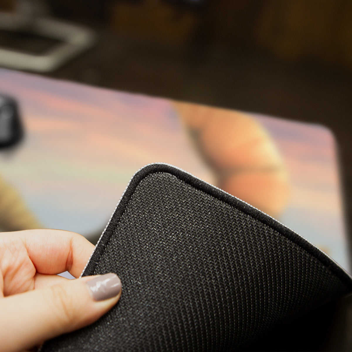 Need a new mousepad that features quality craftsmanship and creativity? Then you’ve definitely come to the right place. Our mousepads are made in-house with premium materials and unique artwork that give your battlestation the supreme look and feel that it deserves. The top is made from sleek polyester, which enables faster, more precise mouse movements. This enhanced speed and precision come in handy whether you’re working or gaming. On the bottom, there’s a strong anti-slip rubber backing that holds a nice, tight grip on your desk while you’re doing your thing. The action and traction this pad provides give you a better overall experience in completing daily tasks, deadlines, and missions of all kinds. And because we’ve added more sizing options to it, you no longer have to worry about running out of room at the worst moments either. The sizes are Classic, Large, and XL. The Classic mousepad has unstitched edges. However, the Large mousepad does include stitched edging, while the XL mousepad has both a stitched or unstitched edging option available. You can see the approximate measurements of all those sizes in the details below. We think you’ll be impressed…if you aren’t already!