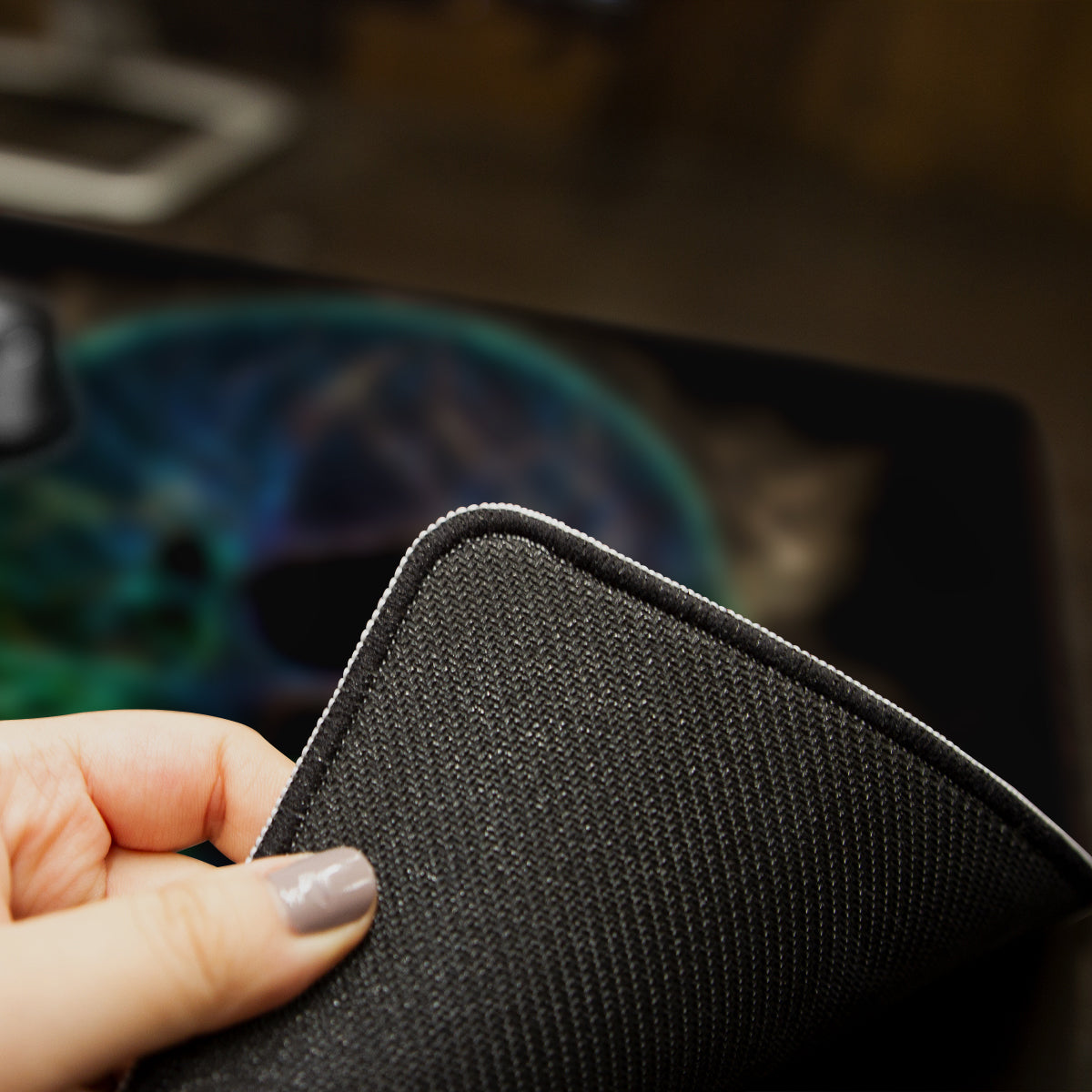 Need a new mousepad that features quality craftsmanship and creativity? Then you’ve definitely come to the right place. Our mousepads are made in-house with premium materials and unique artwork that give your battlestation the supreme look and feel that it deserves. The top is made from sleek polyester, which enables faster, more precise mouse movements. This enhanced speed and precision come in handy whether you’re working or gaming. On the bottom, there’s a strong anti-slip rubber backing that holds a nice, tight grip on your desk while you’re doing your thing. The action and traction this pad provides give you a better overall experience in completing daily tasks, deadlines, and missions of all kinds. And because we’ve added more sizing options to it, you no longer have to worry about running out of room at the worst moments either. The sizes are Classic, Large, and XL. The Classic mousepad has unstitched edges. However, the Large mousepad does include stitched edging, while the XL mousepad has both a stitched or unstitched edging option available. You can see the approximate measurements of all those sizes in the details below. We think you’ll be impressed…if you aren’t already!
