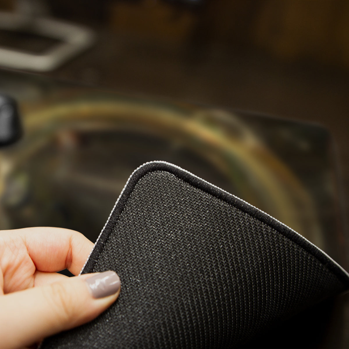 Need a new mousepad that features quality craftsmanship and creativity? Then you’ve definitely come to the right place. Our mousepads are made in-house with premium materials and unique artwork that give your battlestation the supreme look and feel that it deserves. The top is made from sleek polyester, which enables faster, more precise mouse movements. This enhanced speed and precision come in handy whether you’re working or gaming. On the bottom, there’s a strong anti-slip rubber backing that holds a nice, tight grip on your desk while you’re doing your thing. The action and traction this pad provides give you a better overall experience in completing daily tasks, deadlines, and missions of all kinds. And because we’ve added more sizing options to it, you no longer have to worry about running out of room at the worst moments either. The sizes are Classic, Large, and XL. The Classic mousepad has unstitched edges. However, the Large mousepad does include stitched edging, while the XL mousepad has both a stitched or unstitched edging option available. You can see the approximate measurements of all those sizes in the details below. We think you’ll be impressed…if you aren’t already!