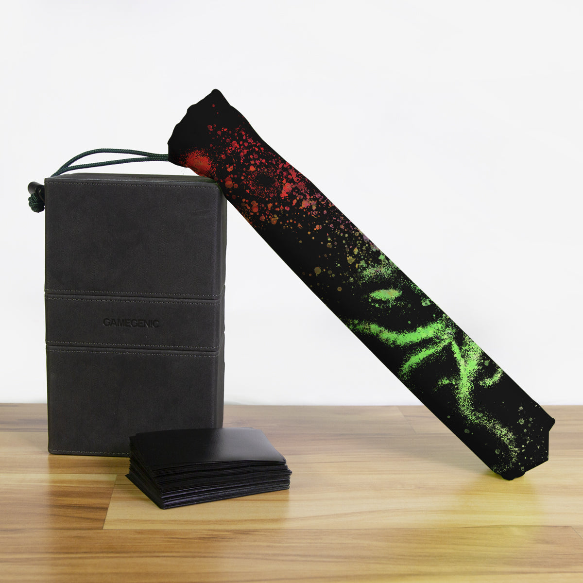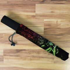 Playmat Bags are specifically designed to hold your mats in style. They are large enough to carry up to two mats. They are coated to be water resistant and include a strap with carabiner for carrying on your backpack. Our bags are hand made in house, and to order. A design that is vertical or patterned would be best for this type of product.