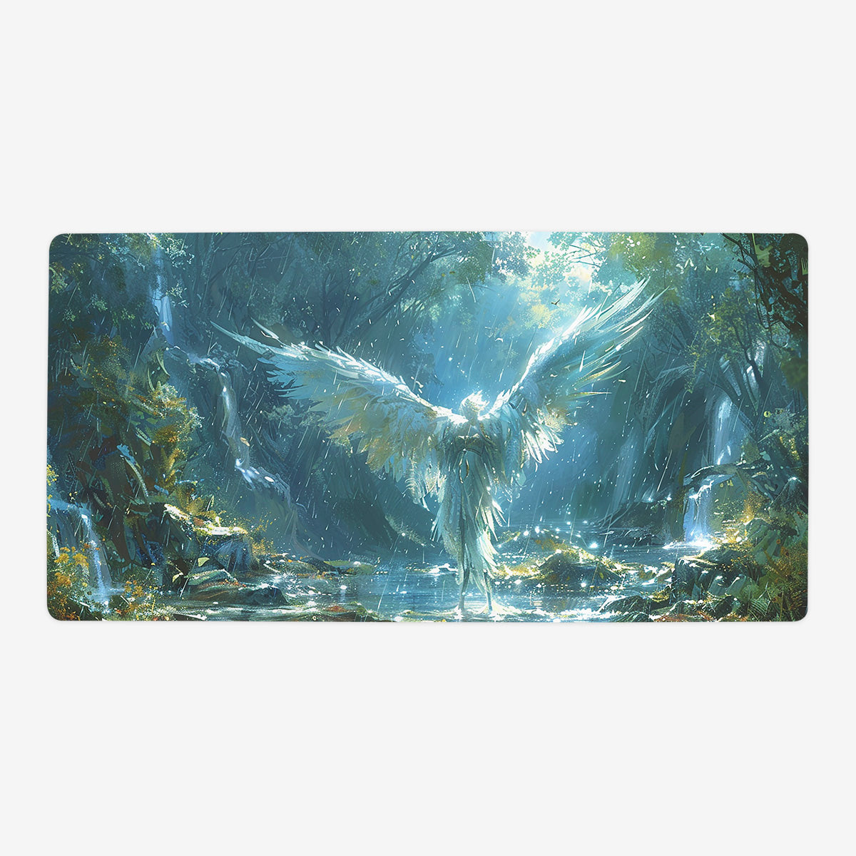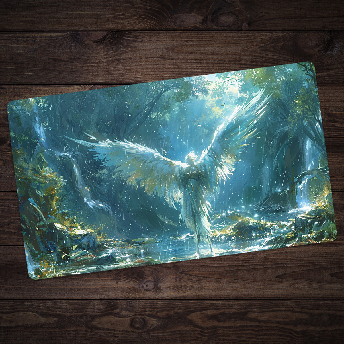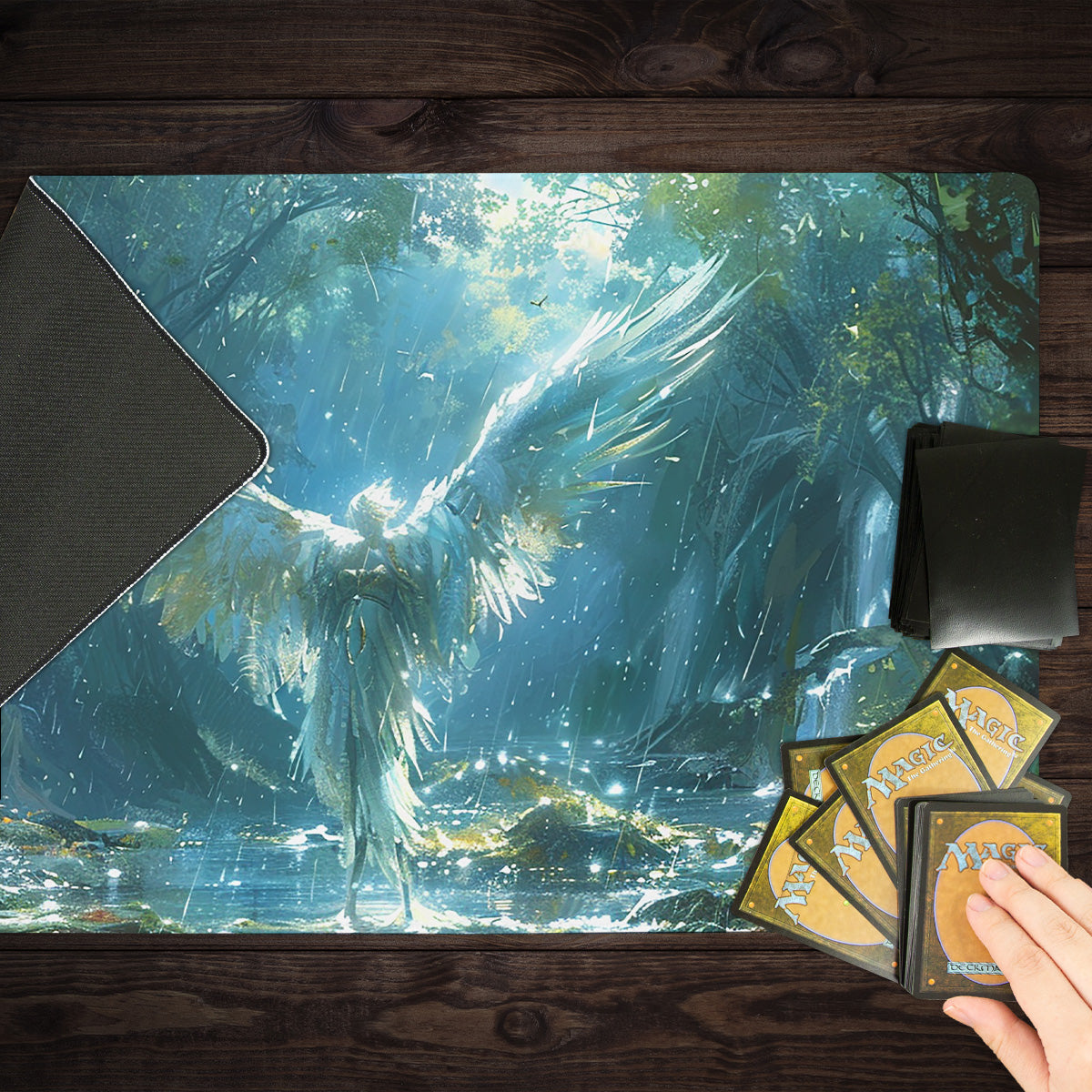 Oversized Playmat measures at 28” x 14” inches and is 1/16 of an inch thick. It’s made with a smooth cloth top and strong rubber backing.