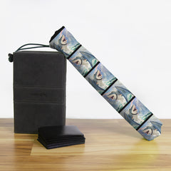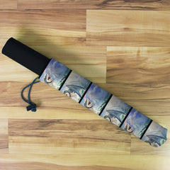 Playmat Bags are specifically designed to hold your mats in style. They are large enough to carry up to two mats. They are coated to be water resistant and include a strap with carabiner for carrying on your backpack. Our bags are hand made in house, and to order. A design that is vertical or patterned would be best for this type of product.