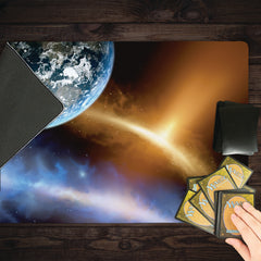 Oversized Playmat measures at 28” x 14” inches and is 1/16 of an inch thick. It’s made with a smooth cloth top and strong rubber backing.