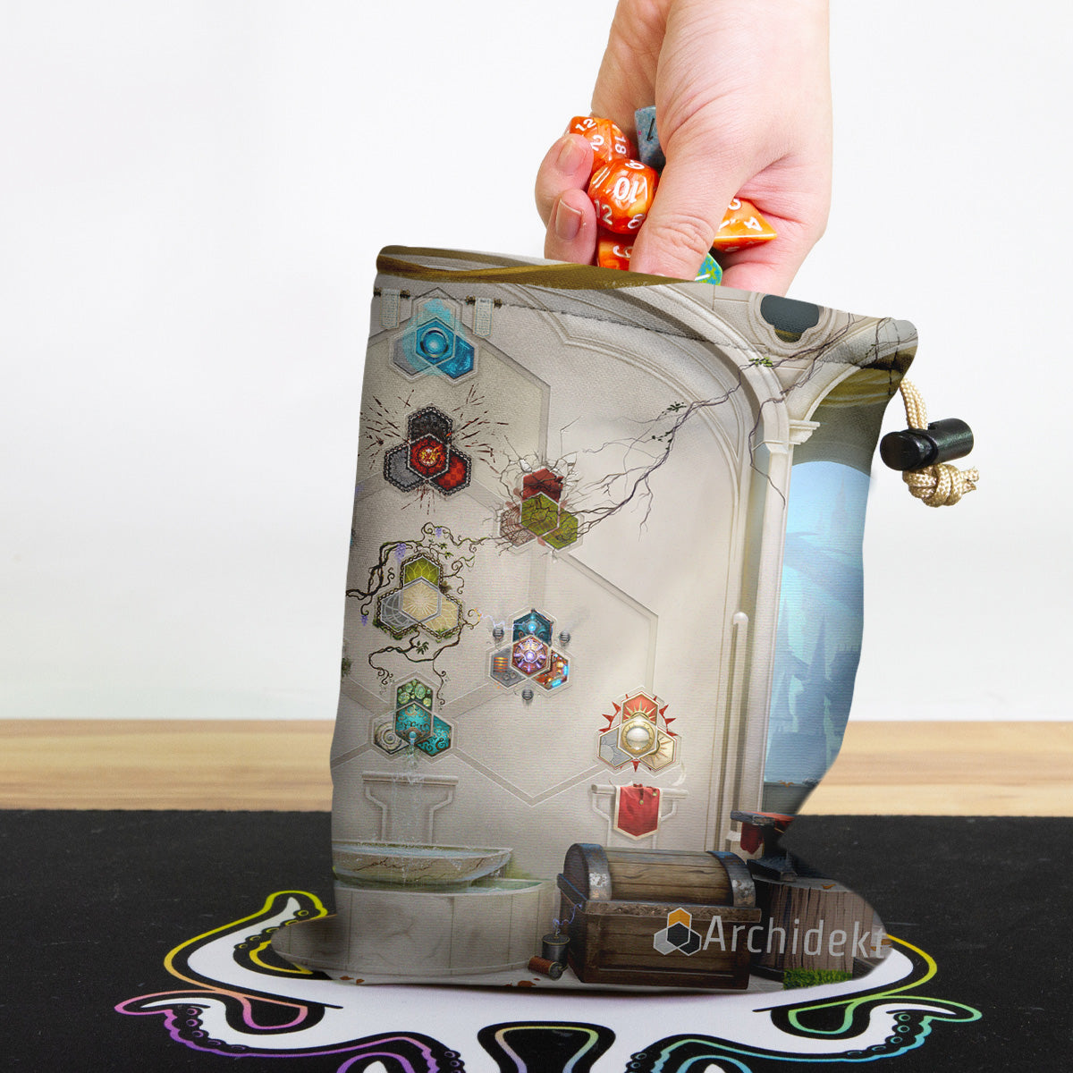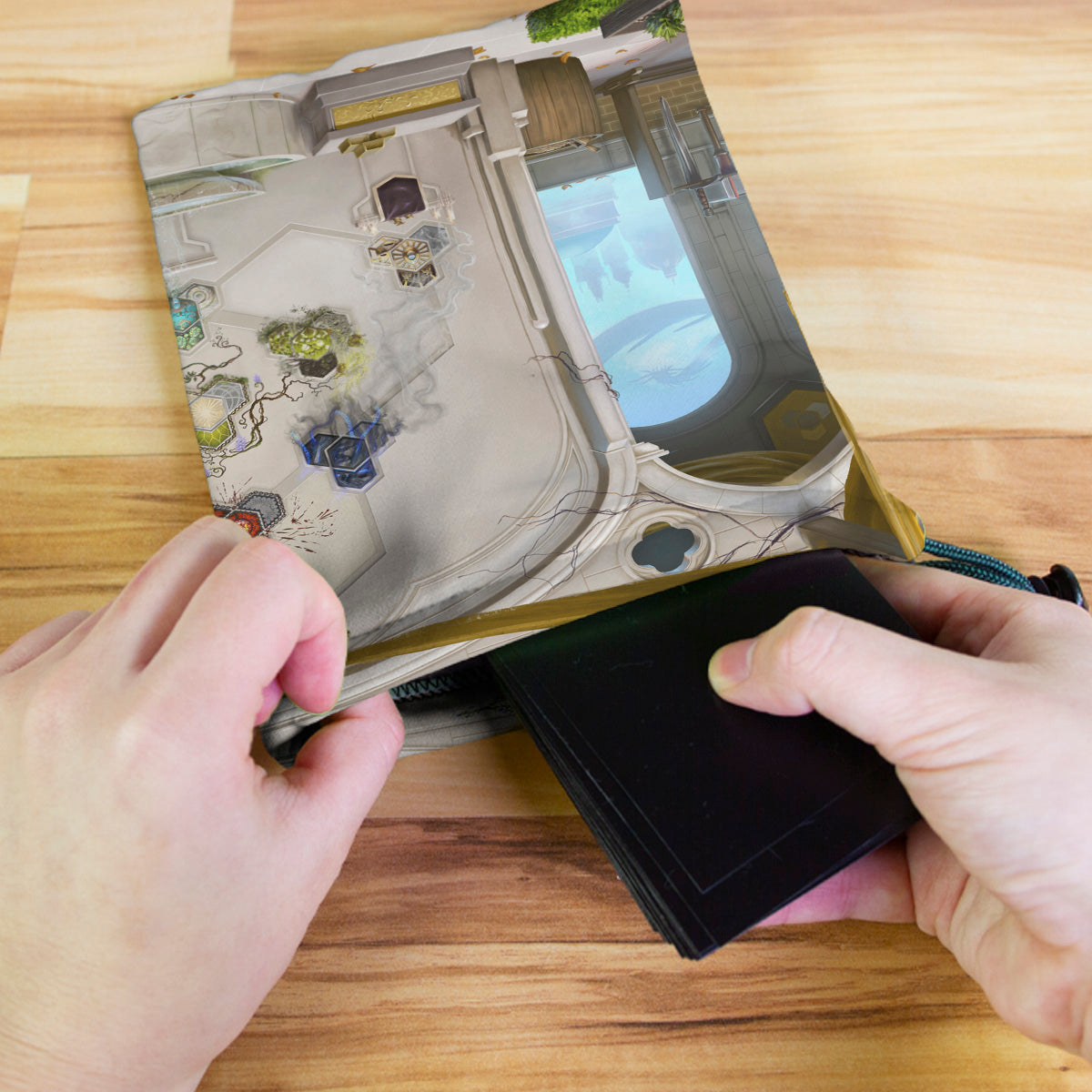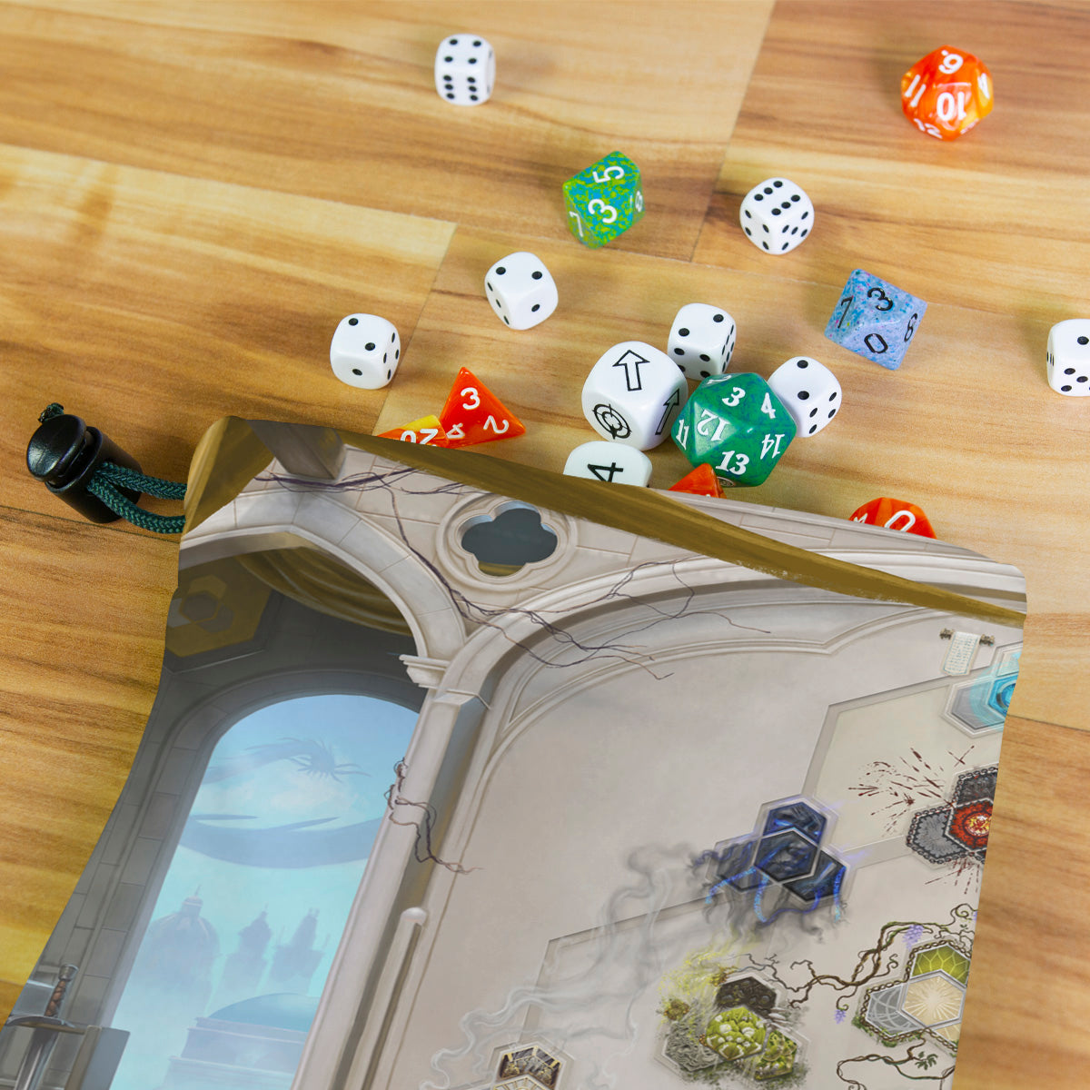 Always gaming on the go? Carry everything you need and more using our specially crafted dice bag. But this bag is designed to hold more than just dice. We make it so you can carry other essential accessories and gear with your dice, including deck boxes, life counters, extra sleeves, and pens. Quality is just as important as quantity, which is why our dice bags are crafted using premium material as well. Featuring a soft inner lining and microfiber on the inside and vibrant pre-designed artwork on the outside, our dice bag has an amazing look and feel to it!
