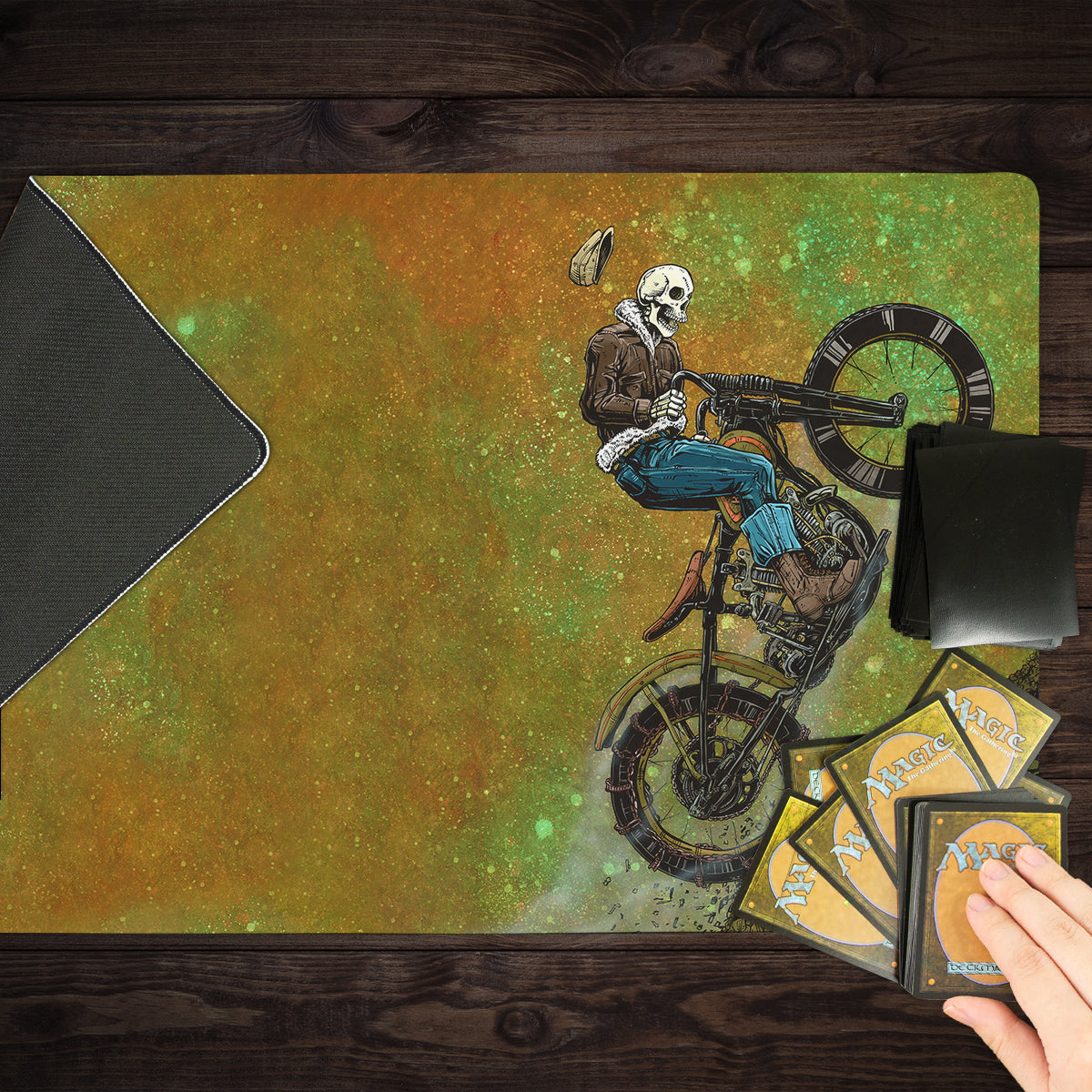 Oversized Playmat measures at 28” x 14” inches and is 1/16 of an inch thick. It’s made with a smooth cloth top and strong rubber backing.