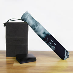 Playmat Bags are specifically designed to hold your mats in style. They are large enough to carry up to two mats. They are coated to be water resistant and include a strap with carabiner for carrying on your backpack. Our bags are hand made in house, and to order. A design that is vertical or patterned would be best for this type of product.