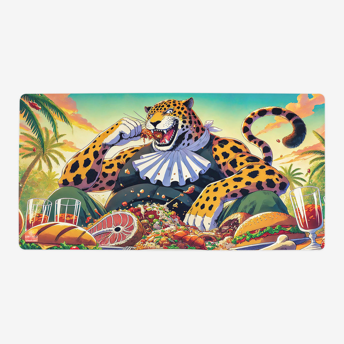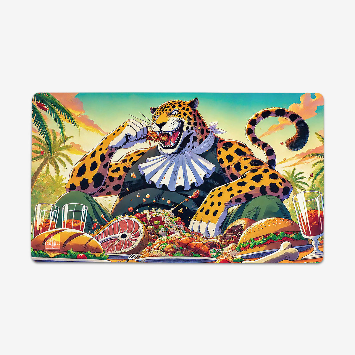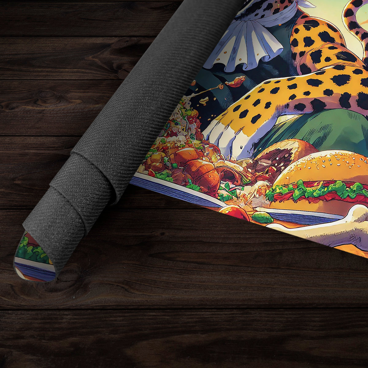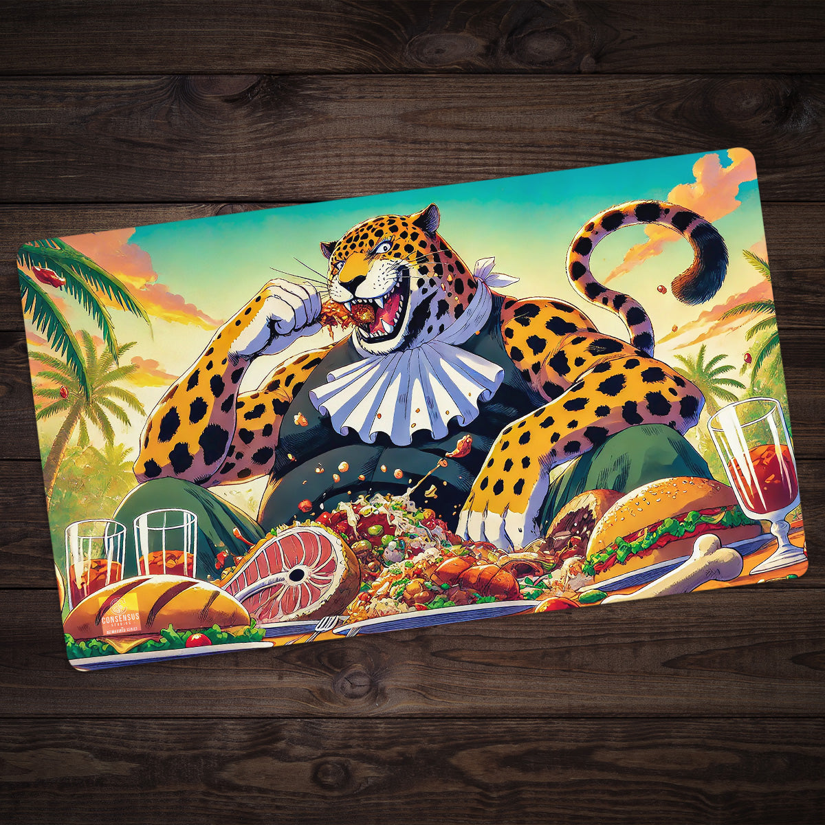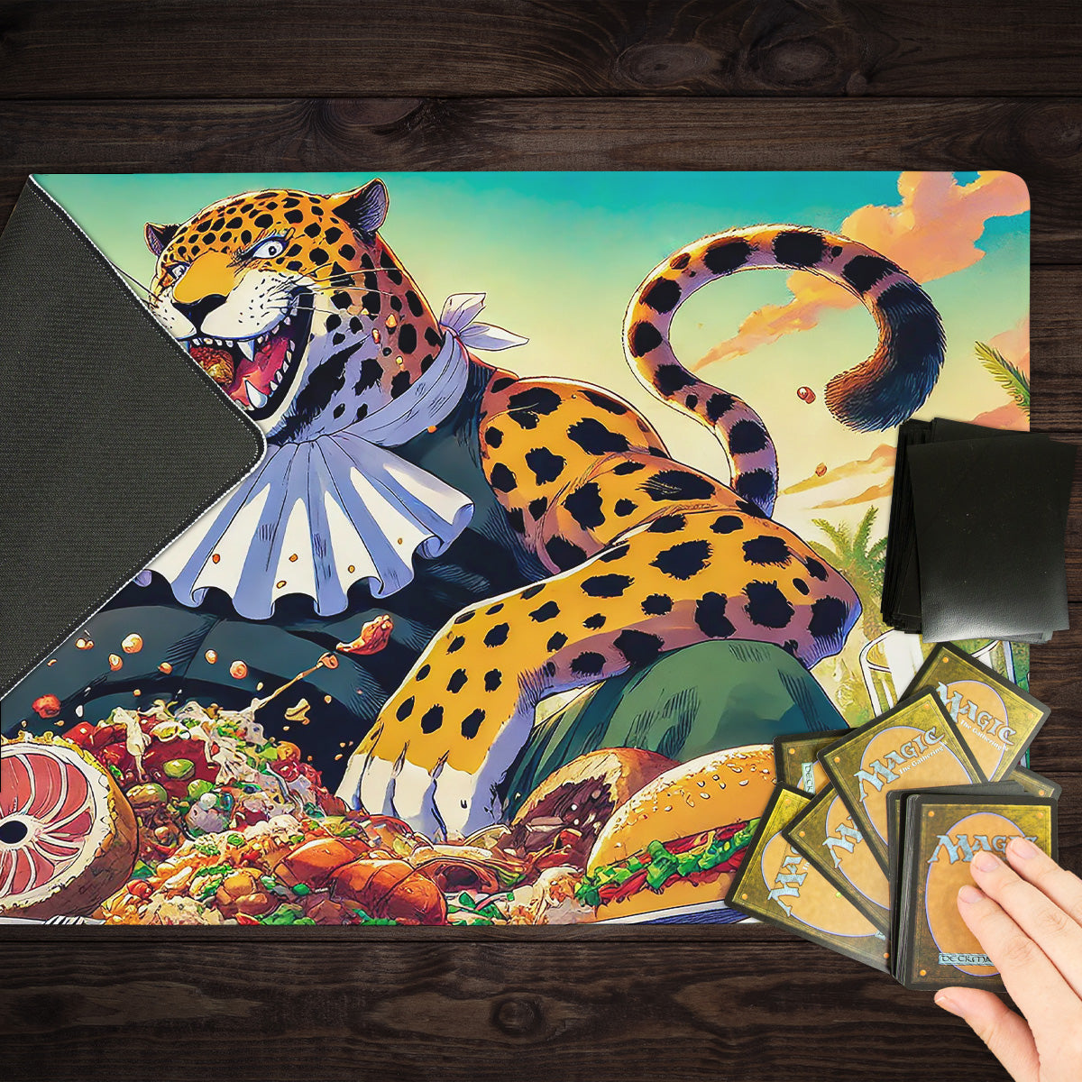 Oversized Playmat measures at 28” x 14” inches and is 1/16 of an inch thick. It’s made with a smooth cloth top and strong rubber backing.