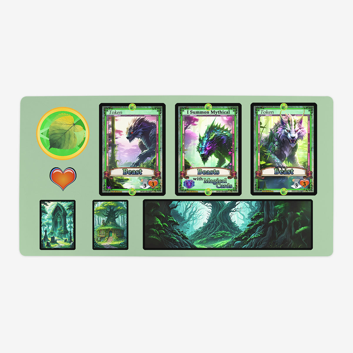 Oversized Playmat measures at 28” x 14” inches and is 1/16 of an inch thick. It’s made with a smooth cloth top and strong rubber backing.