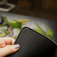 Need a new mousepad that features quality craftsmanship and creativity? Then you’ve definitely come to the right place. Our mousepads are made in-house with premium materials and unique artwork that give your battlestation the supreme look and feel that it deserves. The top is made from sleek polyester, which enables faster, more precise mouse movements. This enhanced speed and precision come in handy whether you’re working or gaming. On the bottom, there’s a strong anti-slip rubber backing that holds a nice, tight grip on your desk while you’re doing your thing. The action and traction this pad provides give you a better overall experience in completing daily tasks, deadlines, and missions of all kinds. And because we’ve added more sizing options to it, you no longer have to worry about running out of room at the worst moments either. The sizes are Classic, Large, and XL. The Classic mousepad has unstitched edges. However, the Large mousepad does include stitched edging, while the XL mousepad has both a stitched or unstitched edging option available. You can see the approximate measurements of all those sizes in the details below. We think you’ll be impressed…if you aren’t already!
