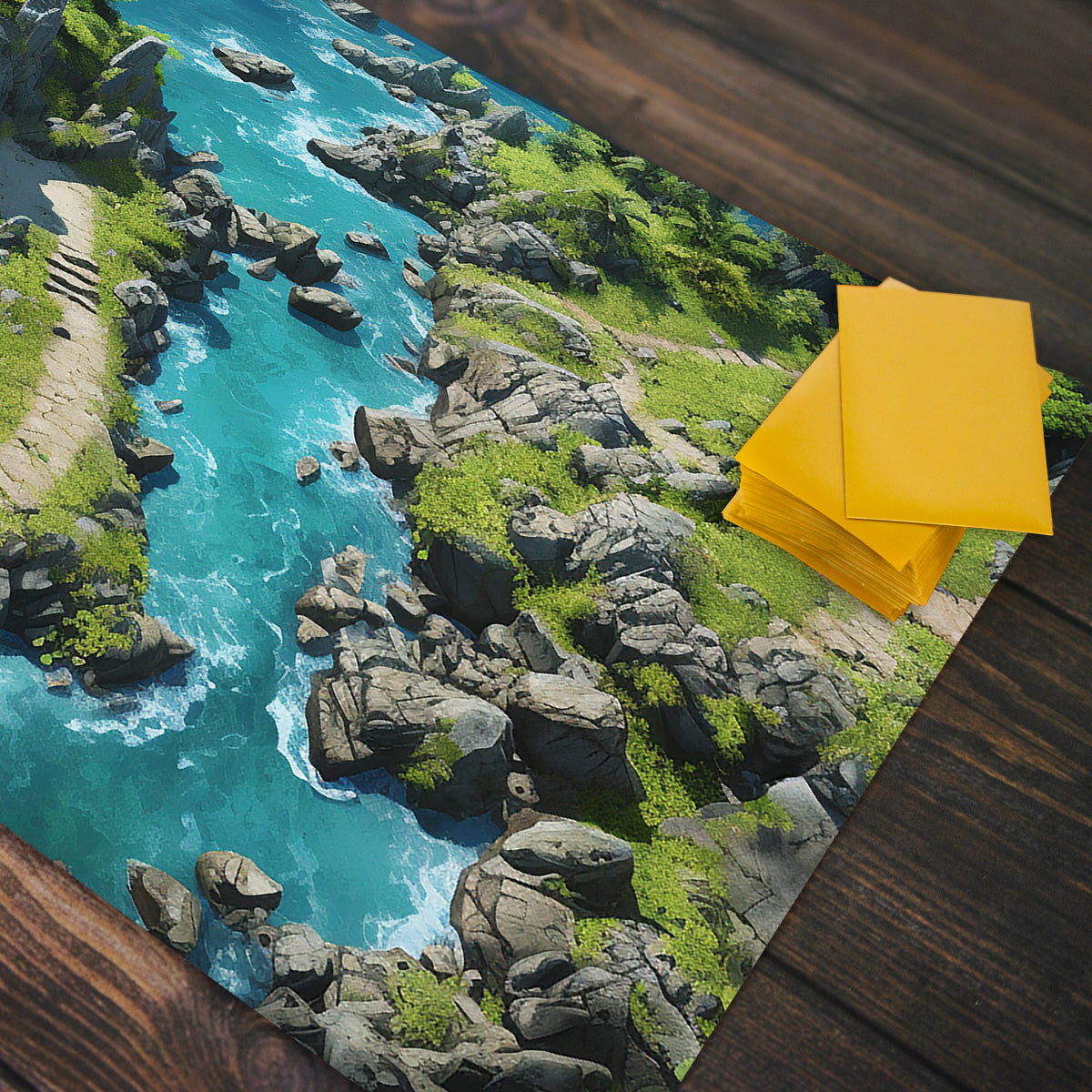 Oversized Playmat measures at 28” x 14” inches and is 1/16 of an inch thick. It’s made with a smooth cloth top and strong rubber backing.
