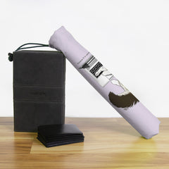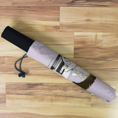 Playmat Bags are specifically designed to hold your mats in style. They are large enough to carry up to two mats. They are coated to be water resistant and include a strap with carabiner for carrying on your backpack. Our bags are hand made in house, and to order. A design that is vertical or patterned would be best for this type of product.
