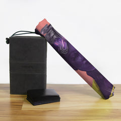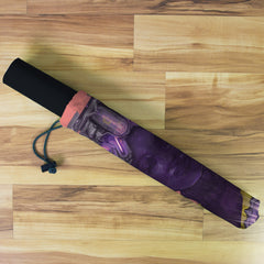 Playmat Bags are specifically designed to hold your mats in style. They are large enough to carry up to two mats. They are coated to be water resistant and include a strap with carabiner for carrying on your backpack. Our bags are hand made in house, and to order. A design that is vertical or patterned would be best for this type of product.