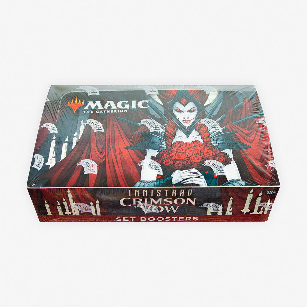 Wizards of the CoastThe Innistrad: Crimson Vow Set Booster Box contains 30 Innistrad: Crimson Vow Set Boosters and 1 traditional foil Dracula Series box topper card. Each Set Booster contains 12 Magic cards, The Innistrad: Crimson Vow Set Booster Box contains 30 Innistrad: Crimson Vow Set Boosters and 1 traditional foil Dracula Series box topper card. Each Set Booster contains 12 Magic cards, 1 Art Card, and 1 token, ad card, Helper card, or special card from Magic's history (a card from "The List"). Each pack contains a combination of 1–4 Rares and/or Mythic Rares, 2–7 Uncommons, 3–8 Commons, and 1 Eternal Night Full-Art Basic Land card. One non–Art Card and non–Land card of any rarity is a traditional foil. The Eternal Night Basic Land card is traditional foil in 15% in packs. A foil-stamped Signature Art Card replaces the Art Card in 5% of Set Boosters, and a card from The List replaces the token or ad card in 25% of Set Boosters
