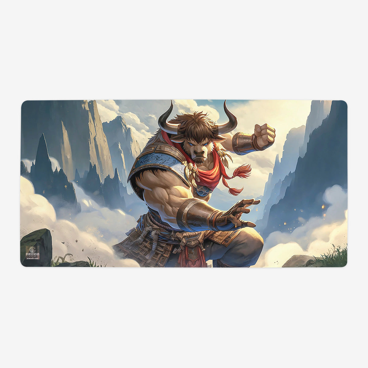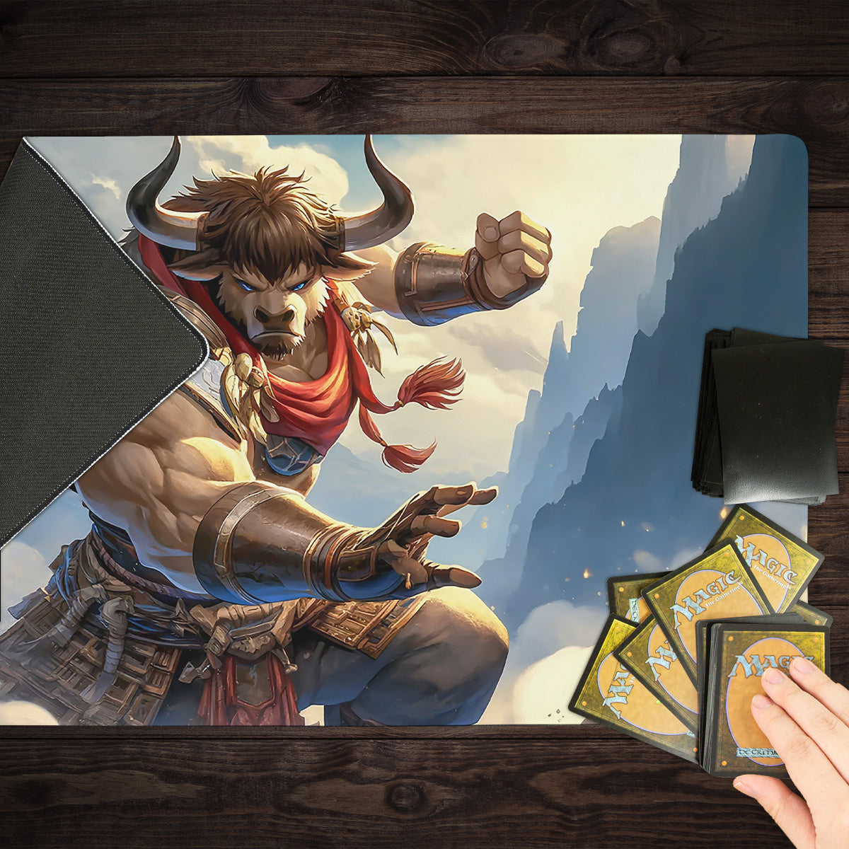 Oversized Playmat measures at 28” x 14” inches and is 1/16 of an inch thick. It’s made with a smooth cloth top and strong rubber backing.