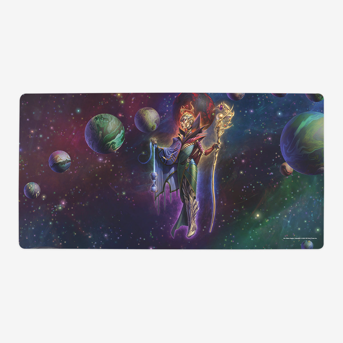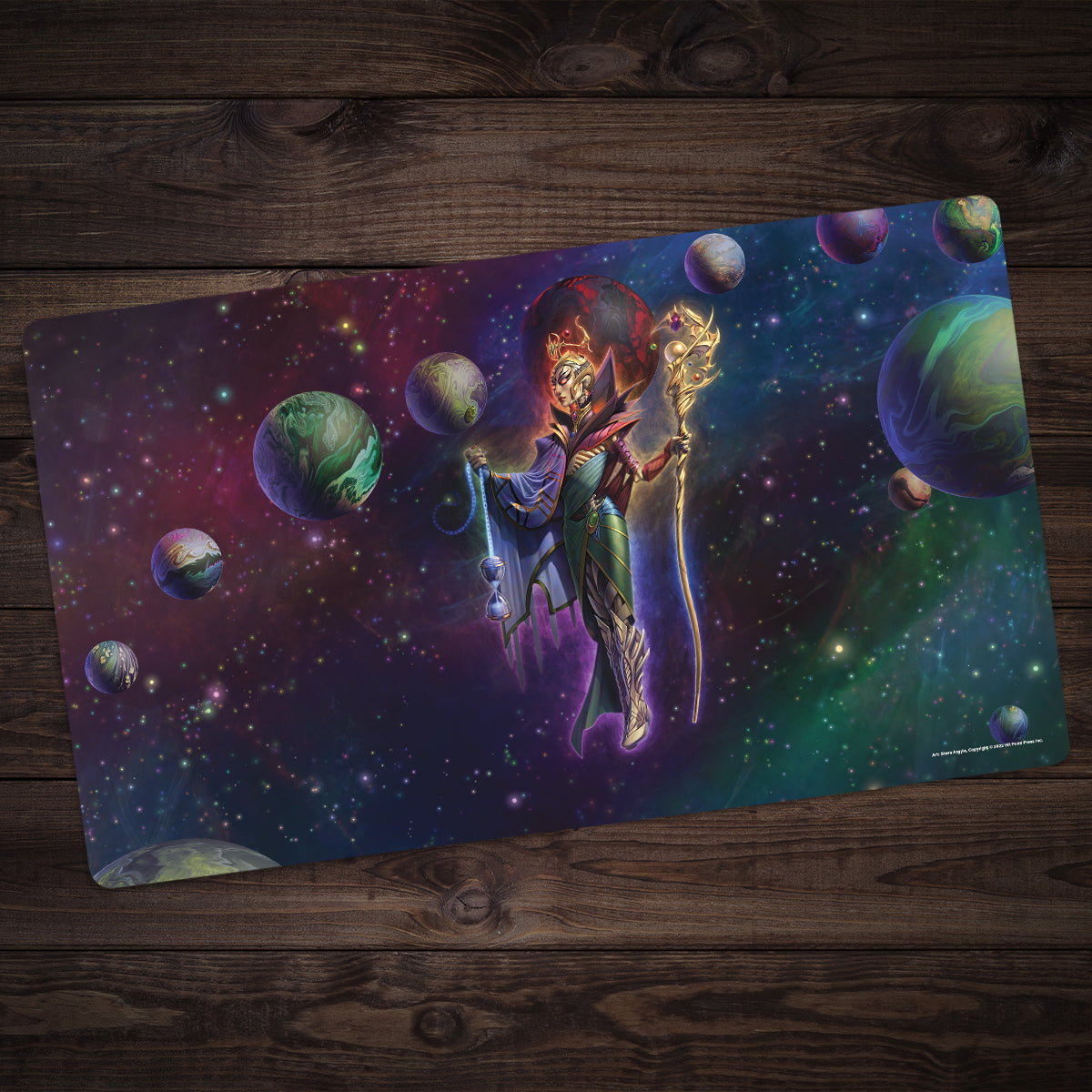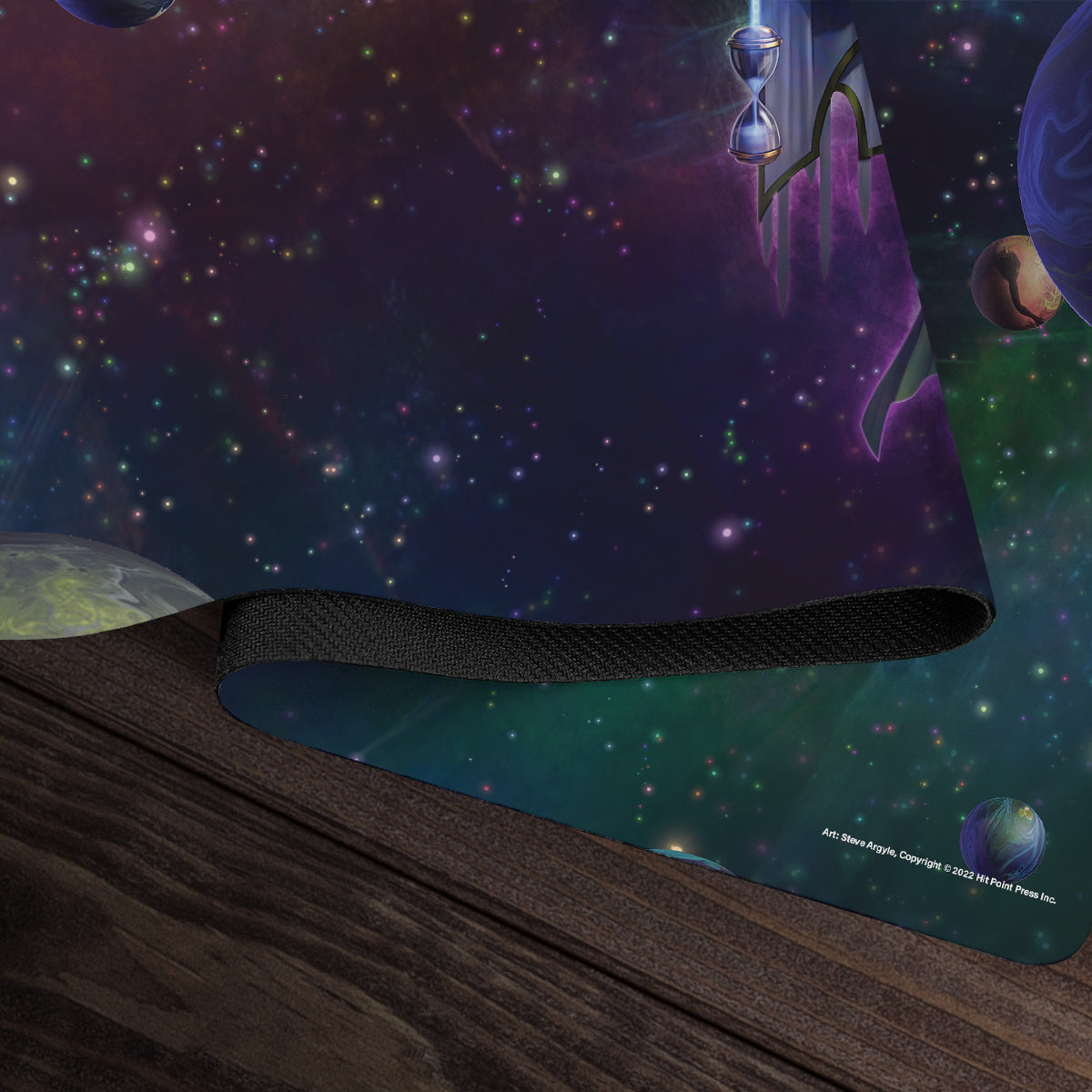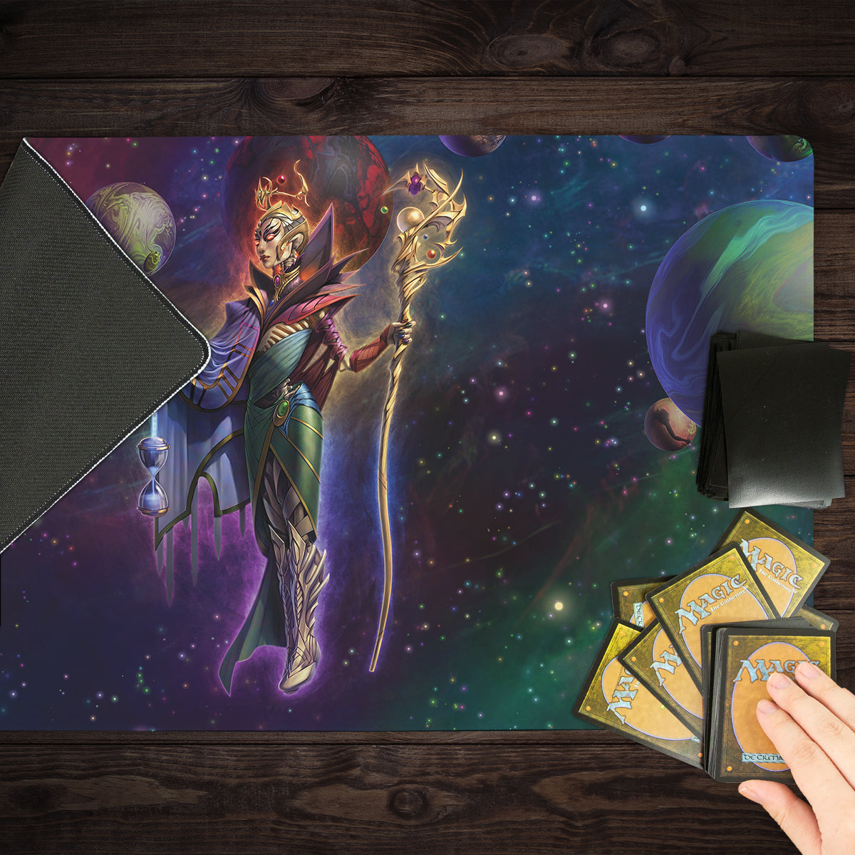 Oversized Playmat measures at 28” x 14” inches and is 1/16 of an inch thick. It’s made with a smooth cloth top and strong rubber backing.