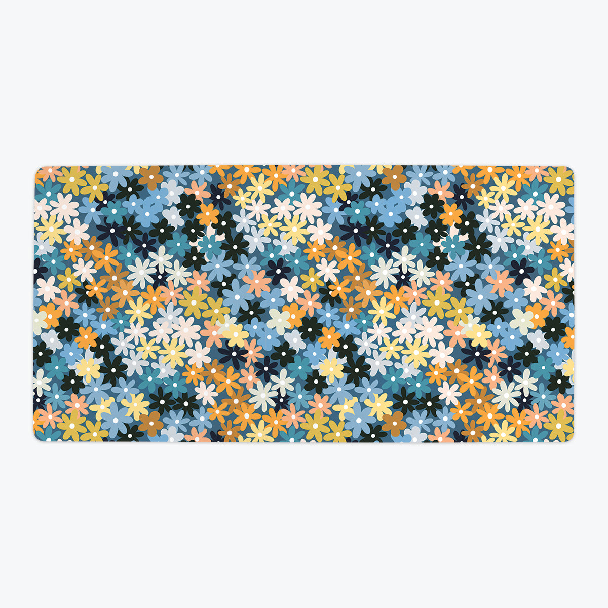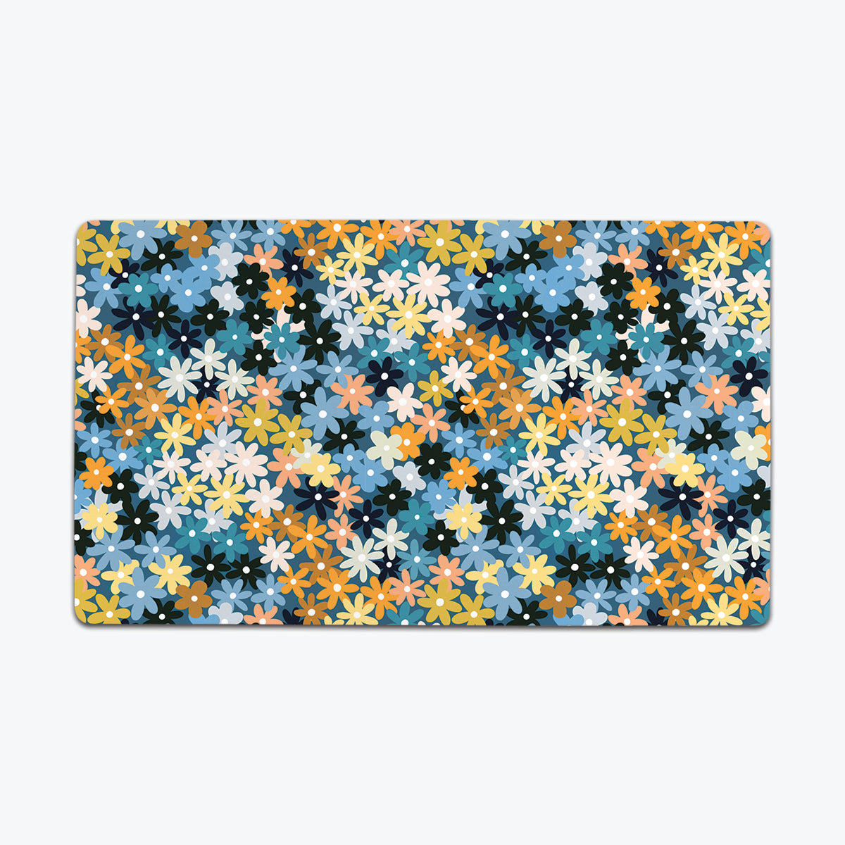 Oversized Playmat measures at 28” x 14” inches and is 1/16 of an inch thick. It’s made with a smooth cloth top and strong rubber backing.