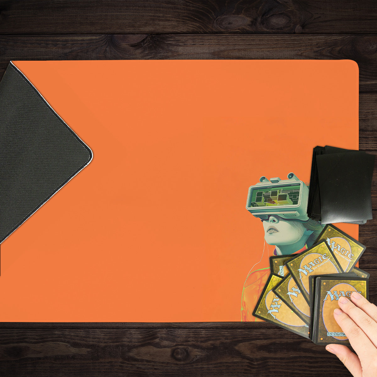 Oversized Playmat measures at 28” x 14” inches and is 1/16 of an inch thick. It’s made with a smooth cloth top and strong rubber backing.