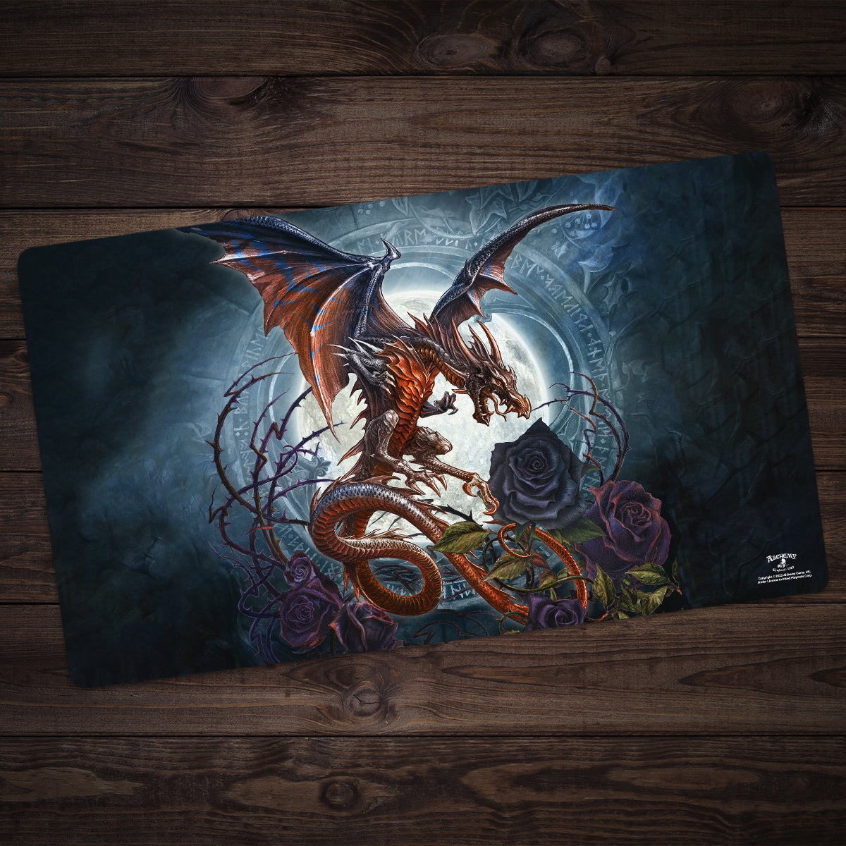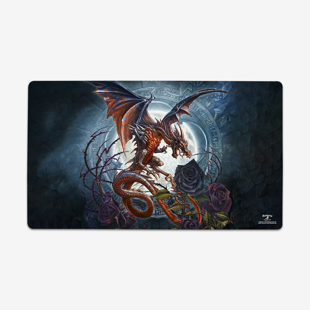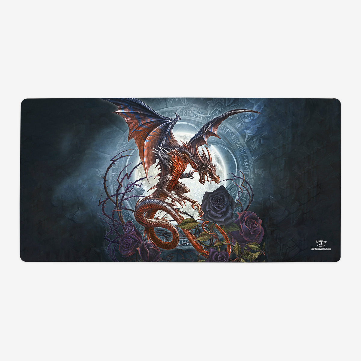 Standard Playmat measures at 24” x 14” inches and is 1/16 of an inch thick. It’s made with a smooth cloth top and strong rubber backing.