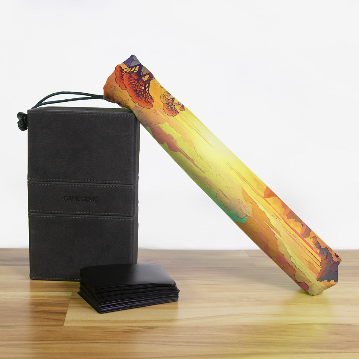 Keep your playmat in pristine condition wherever you go with one of our handcrafted playmat bags. This playmat bag is specifically designed to protect your playmat and can hold two standard sized mats at the same time (in case you need a backup or your friend forgets theirs). Each bag is made in-house and features a water-resistant coating along with a drawstring and carabiner clip for secure carrying. So you can take your game anywhere and in any weather.