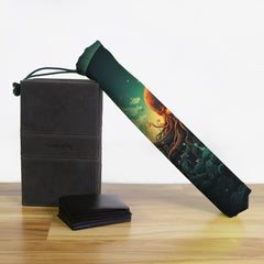 Keep your playmat in pristine condition wherever you go with one of our handcrafted playmat bags. This playmat bag is specifically designed to protect your playmat and can hold two standard sized mats at the same time (in case you need a backup or your friend forgets theirs). Each bag is made in-house and features a water-resistant coating along with a drawstring and carabiner clip for secure carrying. So you can take your game anywhere and in any weather.