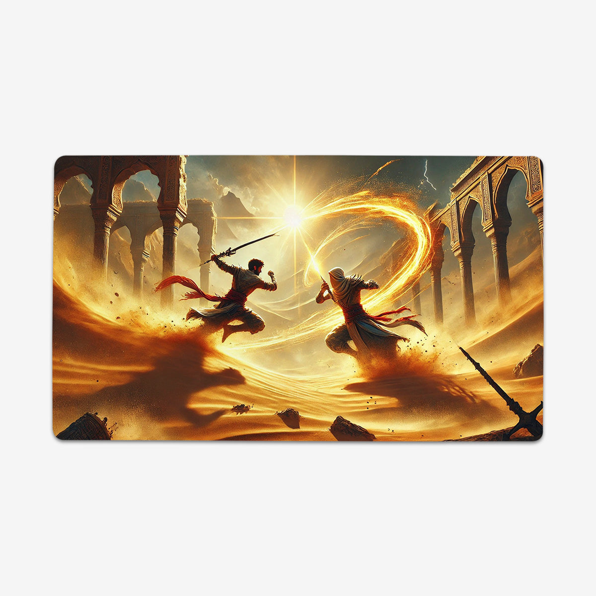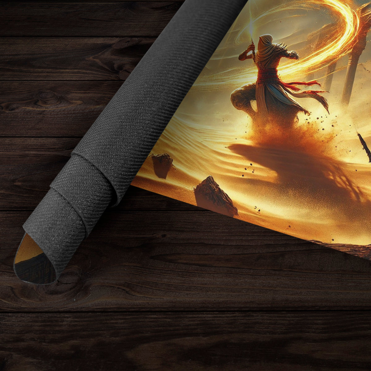 Standard Playmat measures at 24” x 14” inches and is 1/16 of an inch thick. It’s made with a smooth cloth top and strong rubber backing.