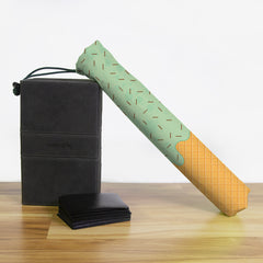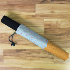 Playmat Bags are specifically designed to hold your mats in style. They are large enough to carry up to two mats. They are coated to be water resistant and include a strap with carabiner for carrying on your backpack. Our bags are hand made in house, and to order. A design that is vertical or patterned would be best for this type of product.