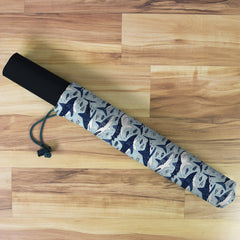 Playmat Bags are specifically designed to hold your mats in style. They are large enough to carry up to two mats. They are coated to be water resistant and include a strap with carabiner for carrying on your backpack. Our bags are hand made in house, and to order. A design that is vertical or patterned would be best for this type of product.