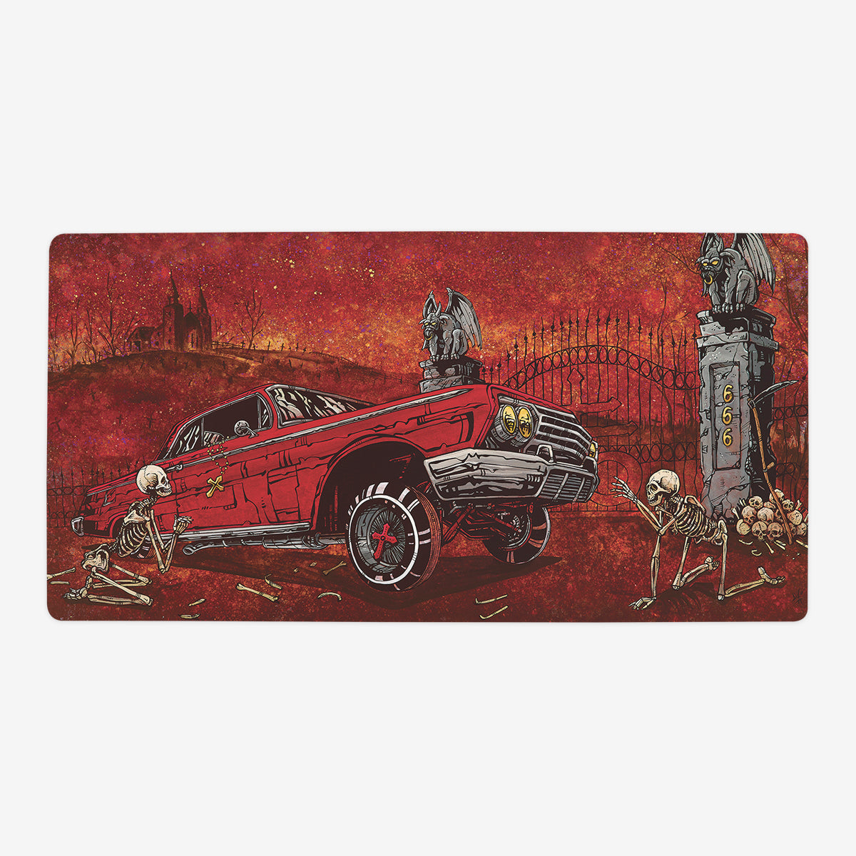 Oversized Playmat measures at 28” x 14” inches and is 1/16 of an inch thick. It’s made with a smooth cloth top and strong rubber backing.