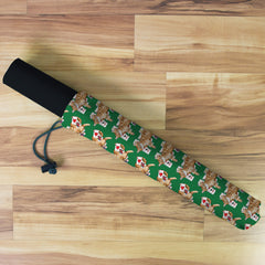 Playmat Bags are specifically designed to hold your mats in style. They are large enough to carry up to two mats. They are coated to be water resistant and include a strap with carabiner for carrying on your backpack. Our bags are hand made in house, and to order. A design that is vertical or patterned would be best for this type of product.