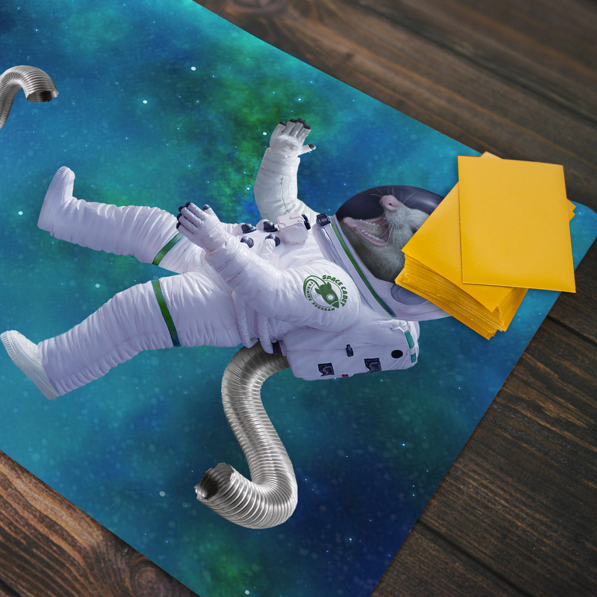 Oversized Playmat measures at 28” x 14” inches and is 1/16 of an inch thick. It’s made with a smooth cloth top and strong rubber backing.