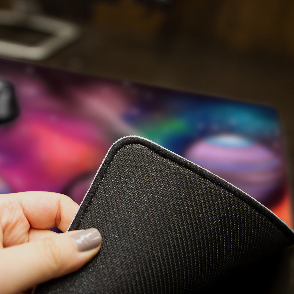 Need a new mousepad that features quality craftsmanship and creativity? Then you’ve definitely come to the right place. Our mousepads are made in-house with premium materials and unique artwork that give your battlestation the supreme look and feel that it deserves. The top is made from sleek polyester, which enables faster, more precise mouse movements. This enhanced speed and precision come in handy whether you’re working or gaming. On the bottom, there’s a strong anti-slip rubber backing that holds a nice, tight grip on your desk while you’re doing your thing. The action and traction this pad provides give you a better overall experience in completing daily tasks, deadlines, and missions of all kinds. And because we’ve added more sizing options to it, you no longer have to worry about running out of room at the worst moments either. The sizes are Classic, Large, and XL. The Classic mousepad has unstitched edges. However, the Large mousepad does include stitched edging, while the XL mousepad has both a stitched or unstitched edging option available. You can see the approximate measurements of all those sizes in the details below. We think you’ll be impressed…if you aren’t already!
