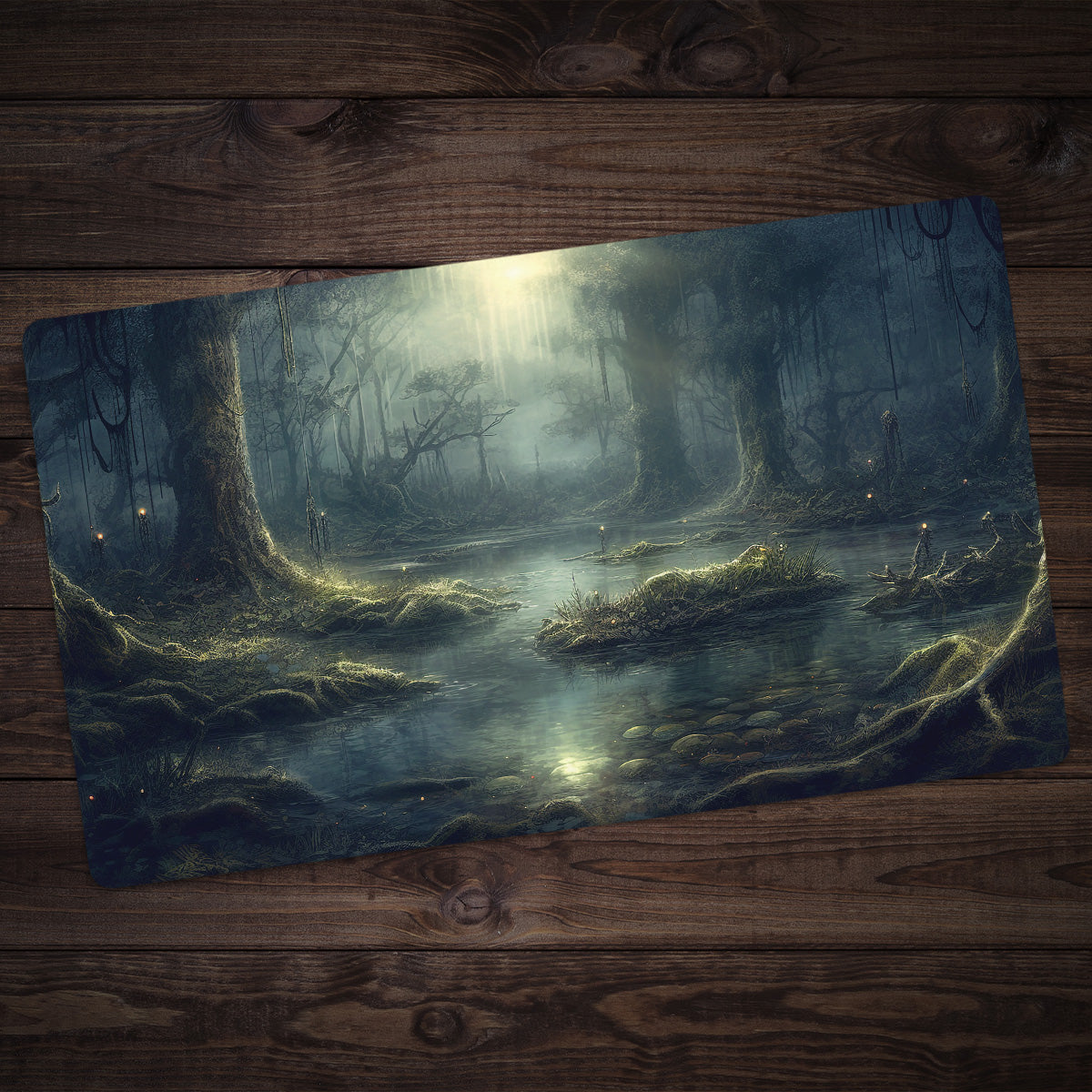 Oversized Playmat measures at 28” x 14” inches and is 1/16 of an inch thick. It’s made with a smooth cloth top and strong rubber backing.