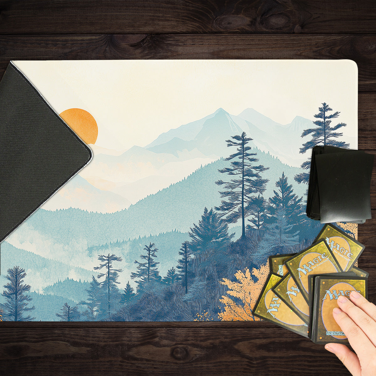 Oversized Playmat measures at 28” x 14” inches and is 1/16 of an inch thick. It’s made with a smooth cloth top and strong rubber backing.