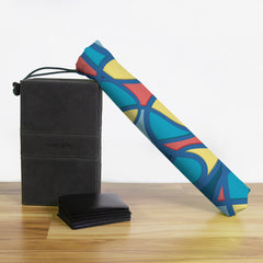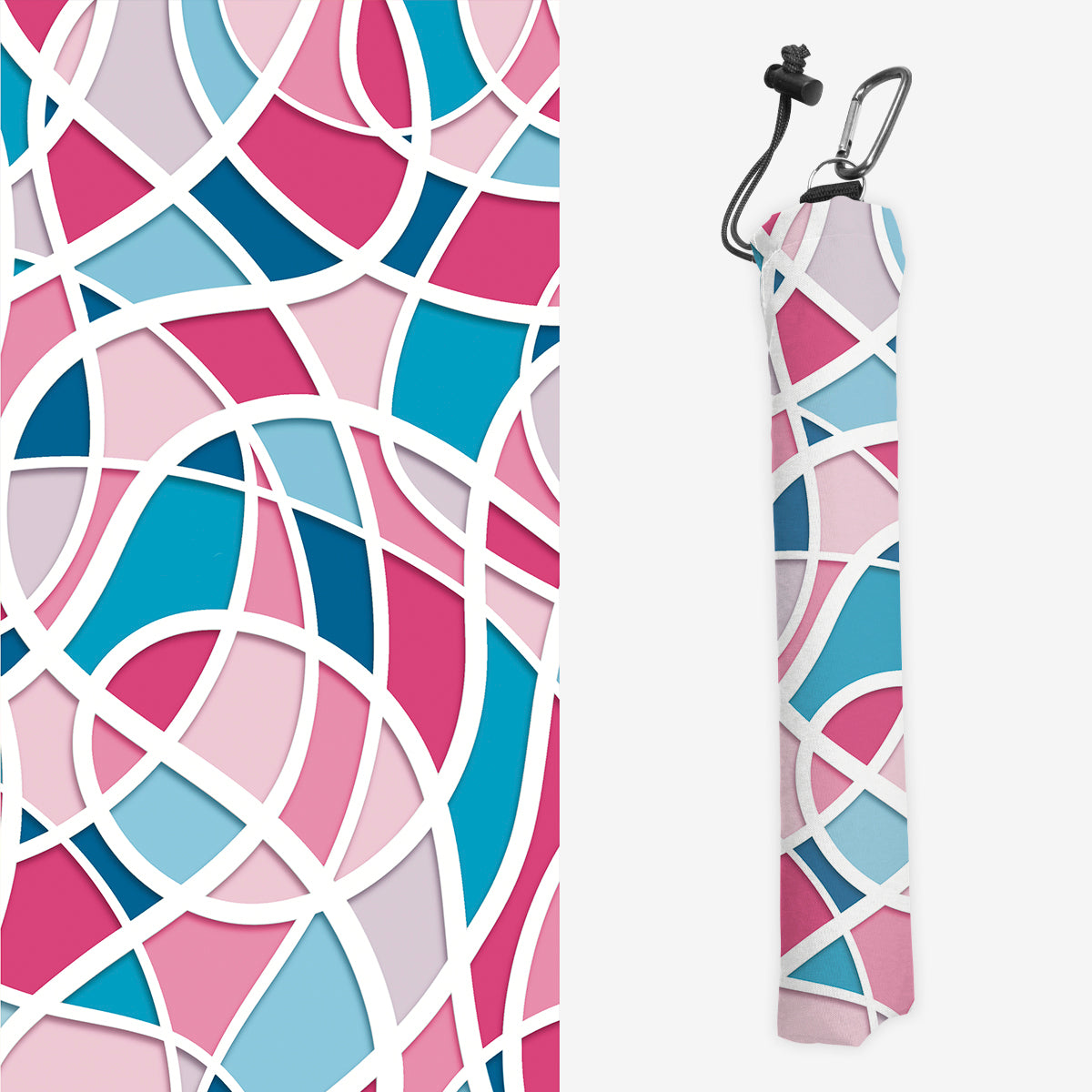 Playmat Bags are specifically designed to hold your mats in style. They are large enough to carry up to two mats. They are coated to be water resistant and include a strap with carabiner for carrying on your backpack. Our bags are hand made in house, and to order. A design that is vertical or patterned would be best for this type of product.