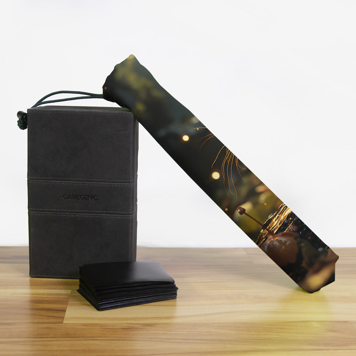 Keep your playmat in pristine condition wherever you go with one of our handcrafted playmat bags. This playmat bag is specifically designed to protect your playmat and can hold two standard sized mats at the same time (in case you need a backup or your friend forgets theirs). Each bag is made in-house and features a water-resistant coating along with a drawstring and carabiner clip for secure carrying. So you can take your game anywhere and in any weather.