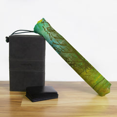 Playmat Bags are specifically designed to hold your mats in style. They are large enough to carry up to two mats. They are coated to be water resistant and include a strap with carabiner for carrying on your backpack. Our bags are hand made in house, and to order. A design that is vertical or patterned would be best for this type of product.