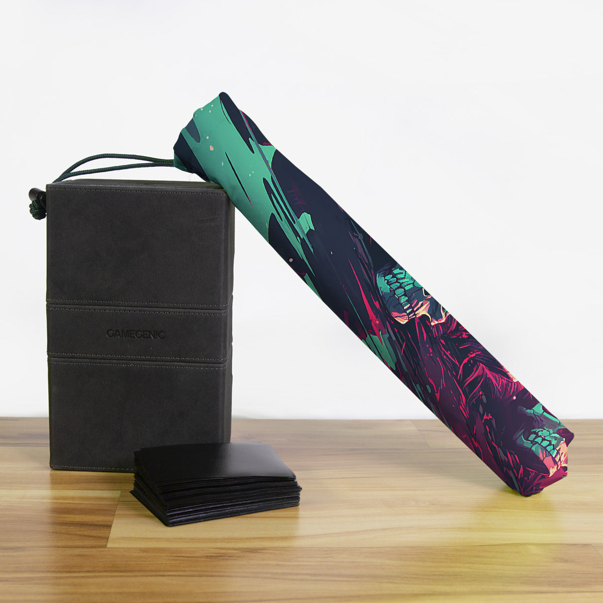 Keep your playmat in pristine condition wherever you go with one of our handcrafted playmat bags. This playmat bag is specifically designed to protect your playmat and can hold two standard sized mats at the same time (in case you need a backup or your friend forgets theirs). Each bag is made in-house and features a water-resistant coating along with a drawstring and carabiner clip for secure carrying. So you can take your game anywhere and in any weather.