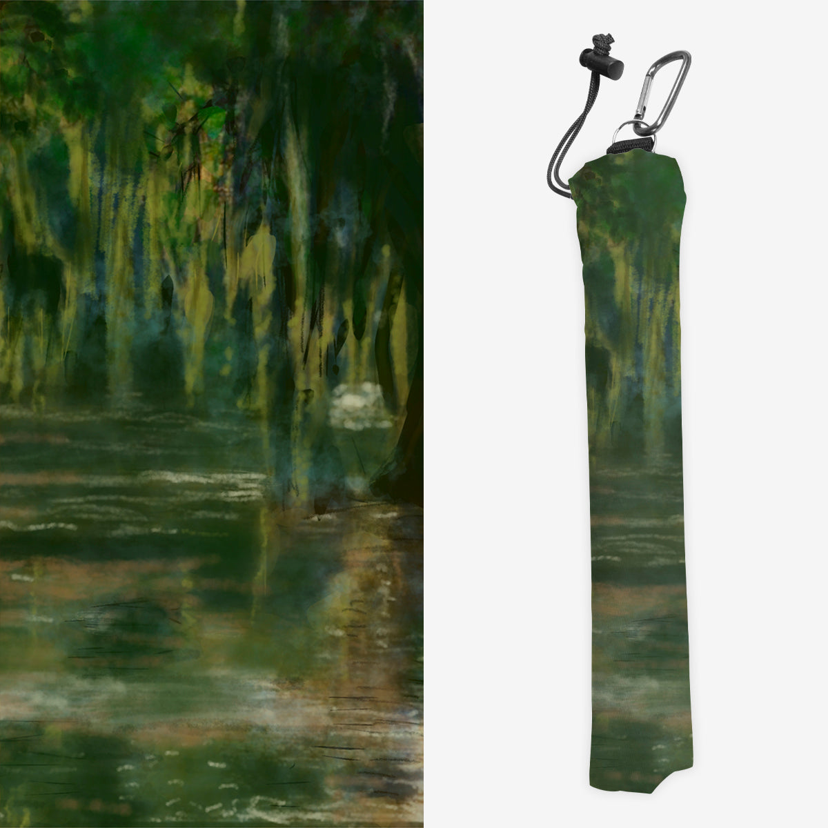 Playmat Bags are specifically designed to hold your mats in style. They are large enough to carry up to two mats. They are coated to be water resistant and include a strap with carabiner for carrying on your backpack. Our bags are hand made in house, and to order. A design that is vertical or patterned would be best for this type of product.