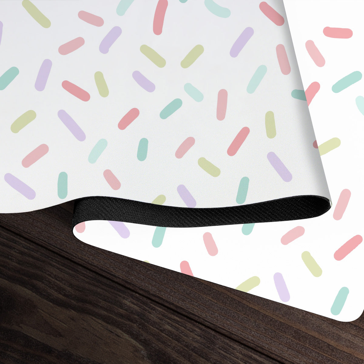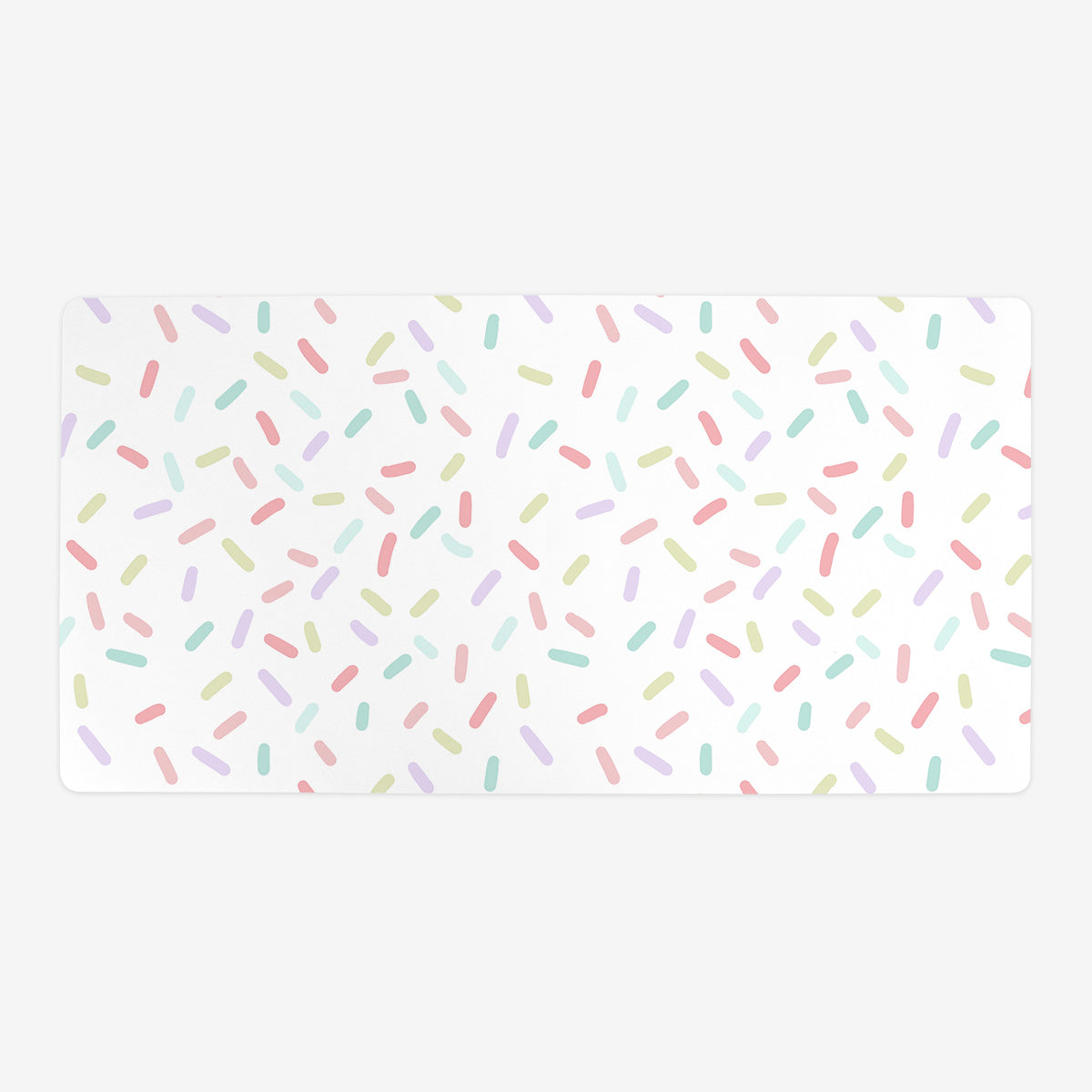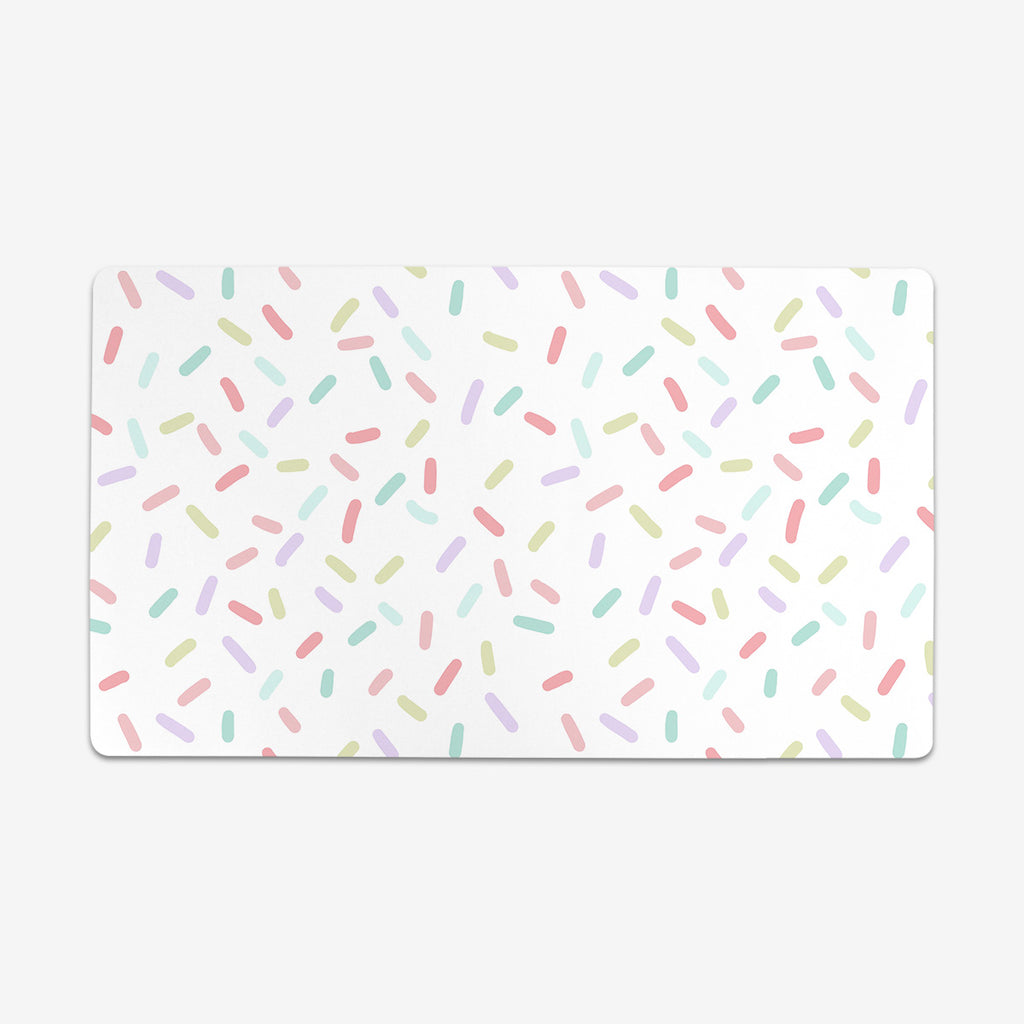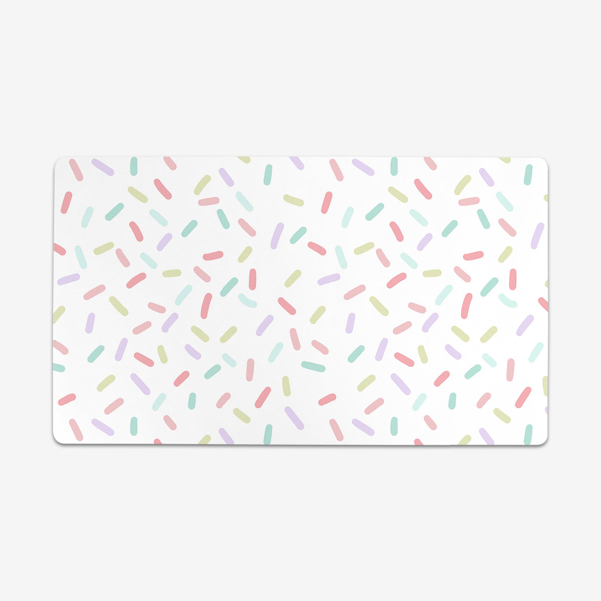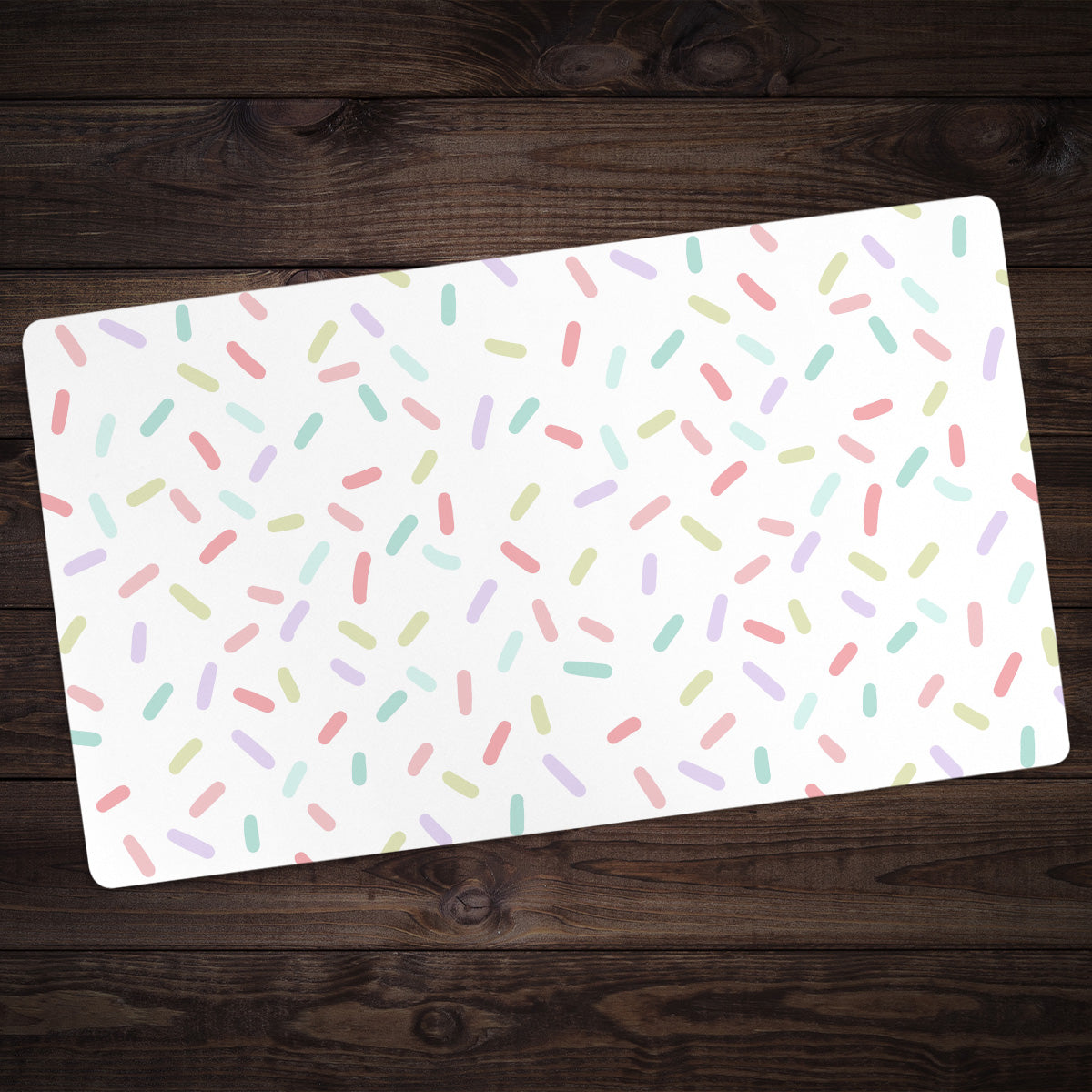 Oversized Playmat measures at 28” x 14” inches and is 1/16 of an inch thick. It’s made with a smooth cloth top and strong rubber backing.