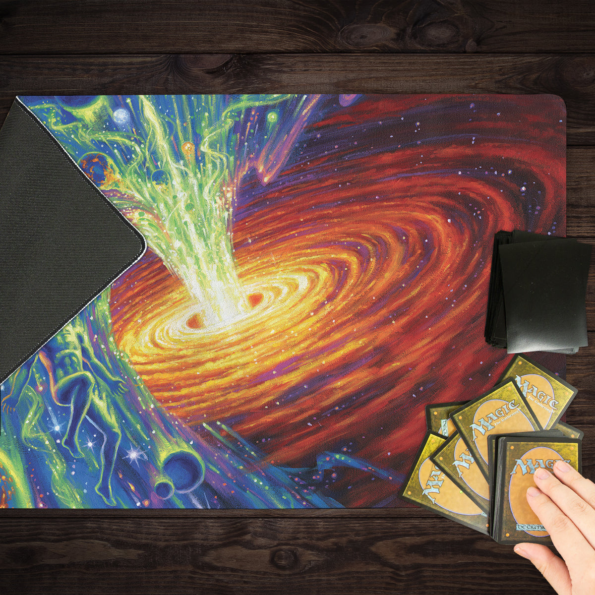 Oversized Playmat measures at 28” x 14” inches and is 1/16 of an inch thick. It’s made with a smooth cloth top and strong rubber backing.